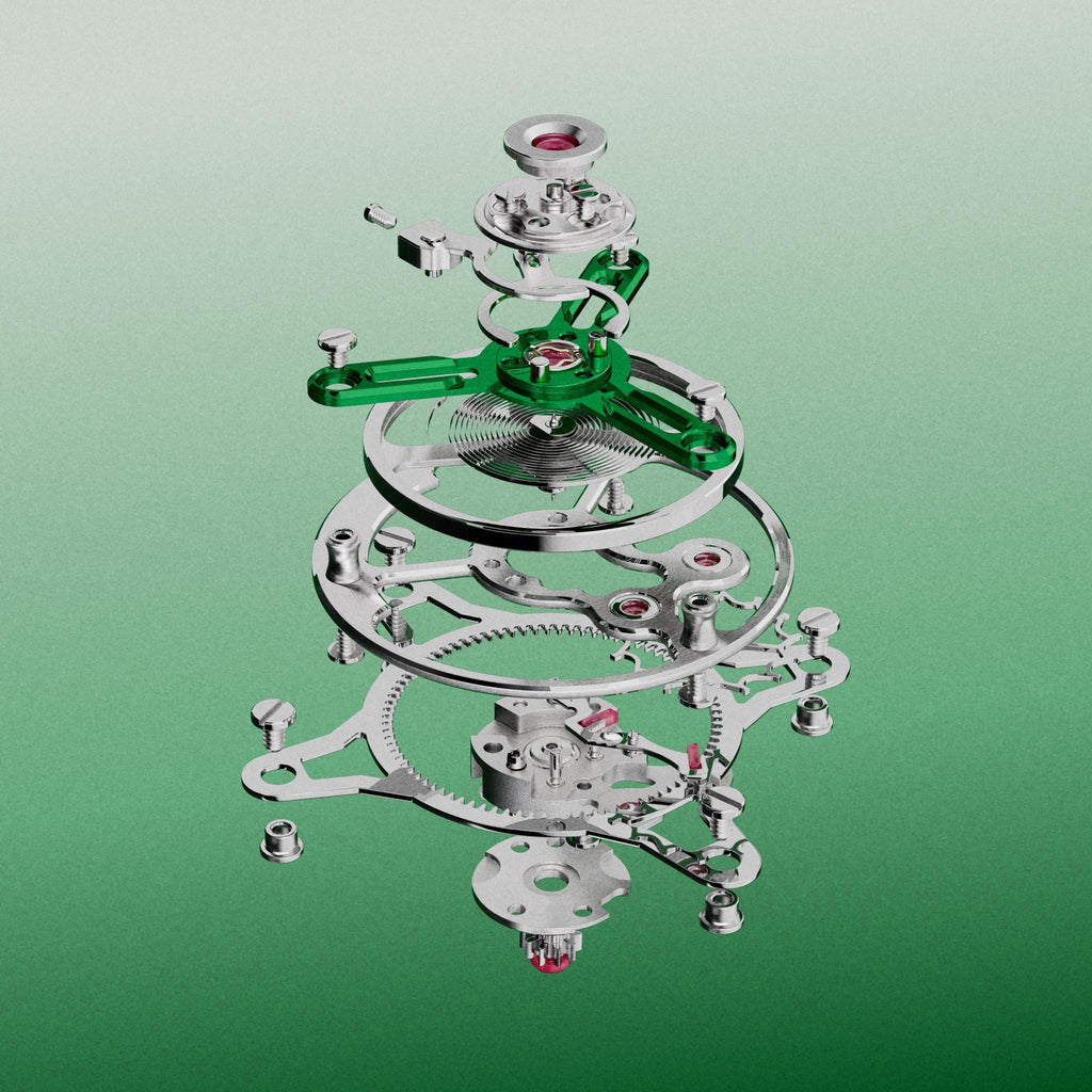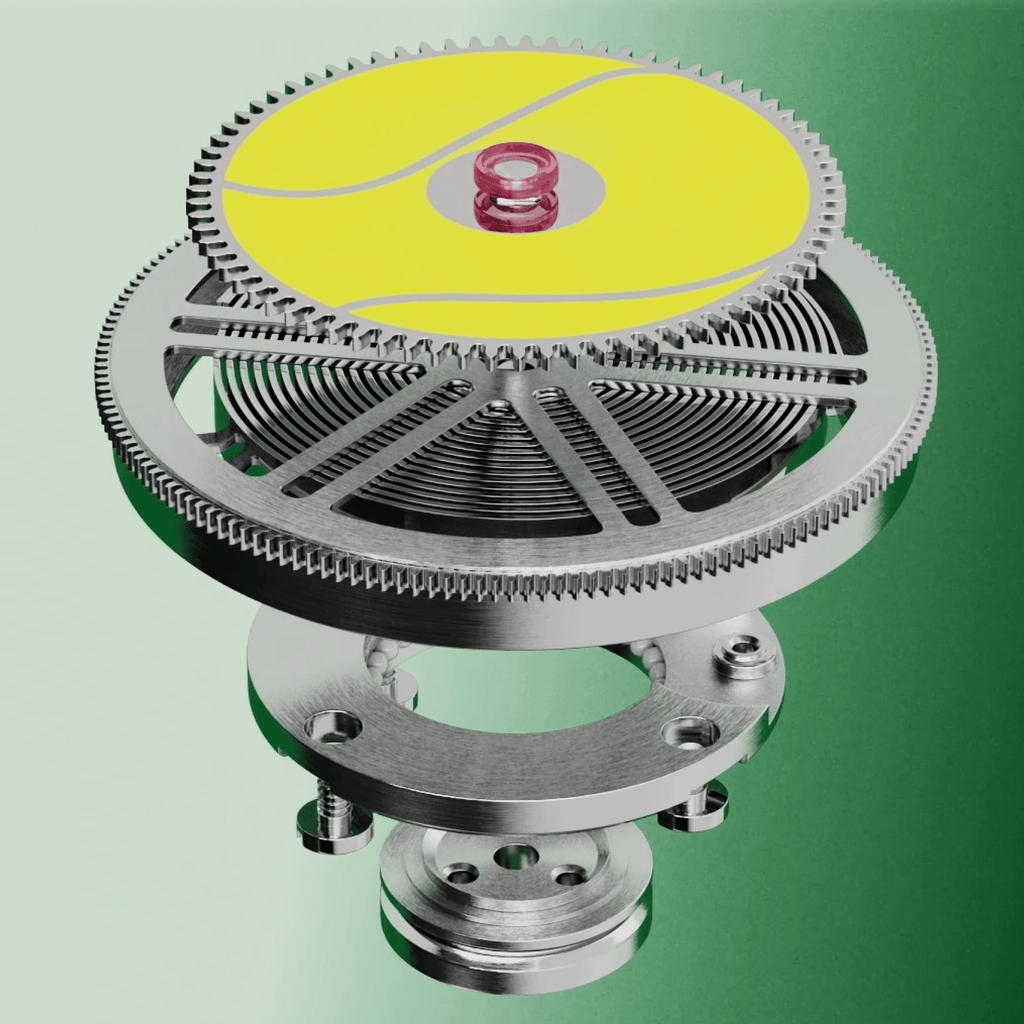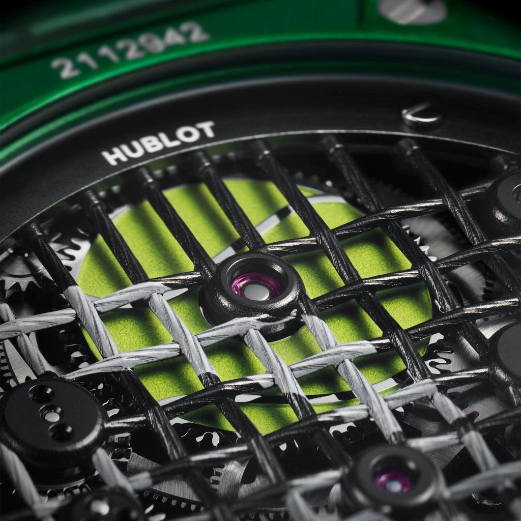 44 mm matte green recycled composite case and bezel made from N. Djokovic’s shirts and rackets, featuring a sapphire crystal dial, Gorilla tempered glass with anti-reflective treatment, 30 m water resistance, and HUB6035 manufacture automatic tourbillon movement with an approximate 72-hour power reserve, paired with a white calfskin and green Velcro strap, plus an additional white structured rubber strap and polished green aluminium sport buckle.