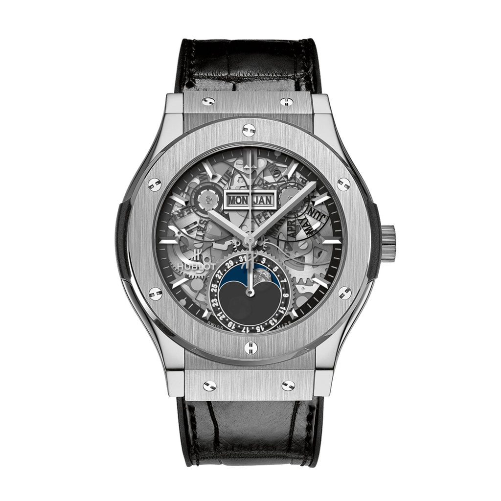 Hublot Classic Fusion Aerofusion Moonphase in a 42mm titanium case with sapphire dial on black rubber and alligator straps, featuring a moonphase, day, date, and month display, and HUB1131 self-winding moonphase movement with up to 42 hours of power reserve.