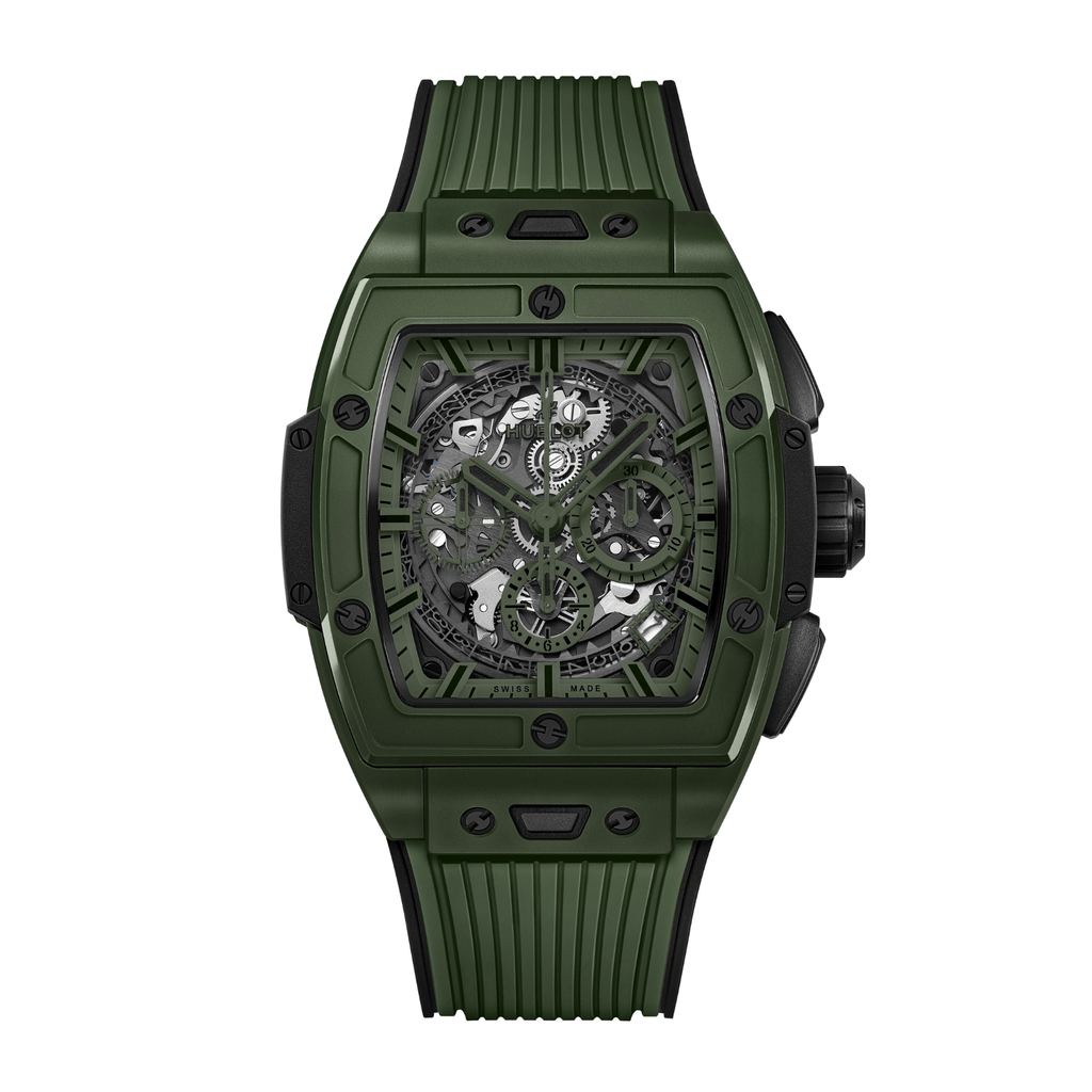 The Hublot Spirit Of Big Bang Dark Green Ceramic 42mm features a 42mm case size that has been Microblasted and Polished. The bezel is also Microblasted and Polished, and made of dark green ceramic. It has a water resistance of 100m or 10 ATM. The crystal is made of Sapphire with Anti-reflective Treatment and the dial is Sapphire Crystal. The movement is powered by the HUB4700 Self-winding Skeleton Chronograph Movement and has a power reserve of 50 Hours. Black and dark green lined structured rubber strap.