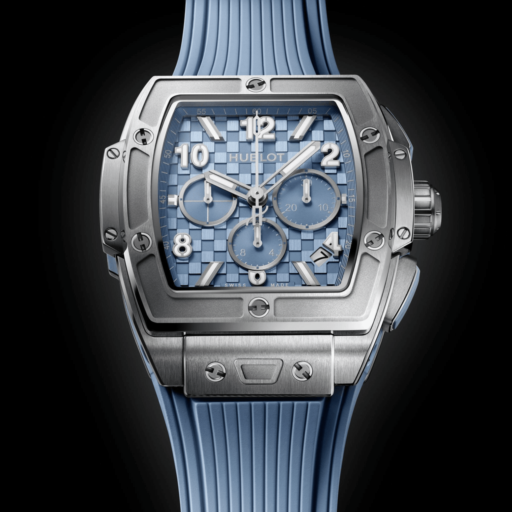 42 mm satin-finished and polished titanium case with a satin-finished, polished, and microblasted titanium bezel featuring six H-shaped titanium screws, sapphire crystal with anti-reflective treatment, coal blue carbon-effect dial, 100 m water resistance, and HUB4700 self-winding skeleton chronograph movement with an approximate 50-hour power reserve, paired with coal blue structured rubber straps and a titanium deployant buckle clasp.