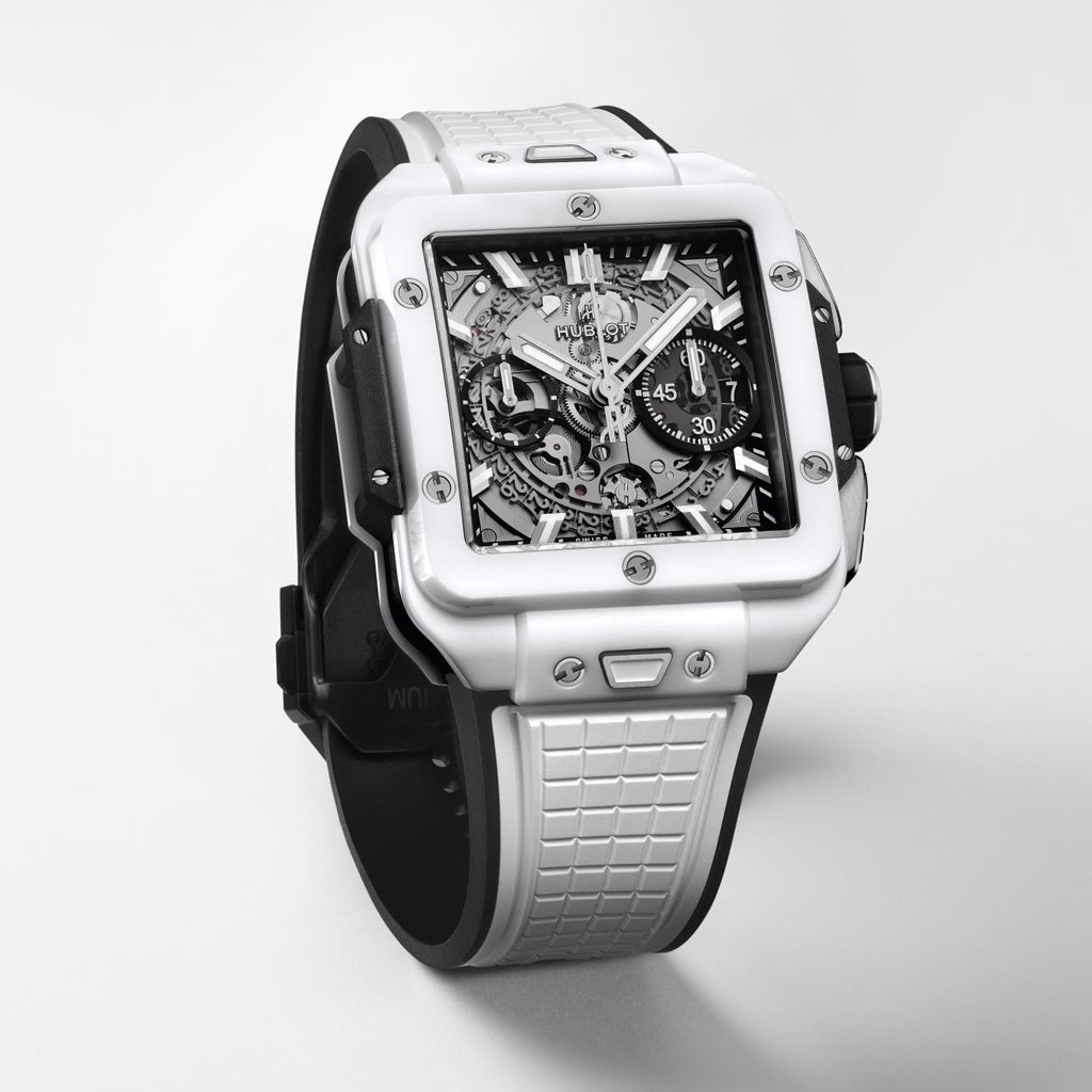 Hublot Square Bang Unico White Ceramic in a 42mm white ceramic case with blue skeleton dial on rubber strap, featuring a chronograph function and automatic movement with approximately 72 hours power reserve.