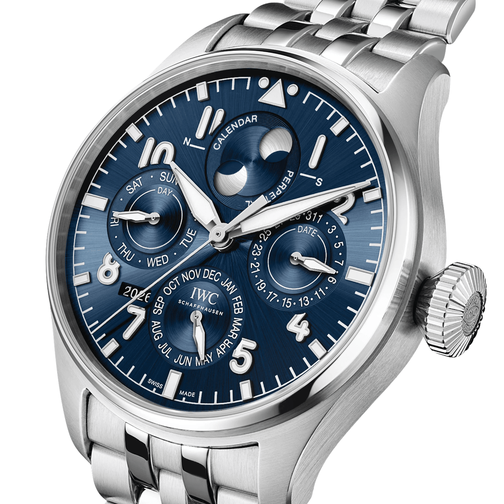 The Big Pilot's Watch Perpetual Calendar ProSet Le Petit Prince combines a stainless steel case and bracelet with a deep blue dial with a sunray finish. The Perpetual Calendar ProSet can be adjusted both forwards and backwards via a single crown position, making calendar adjustments as simple and intuitive as setting the time.