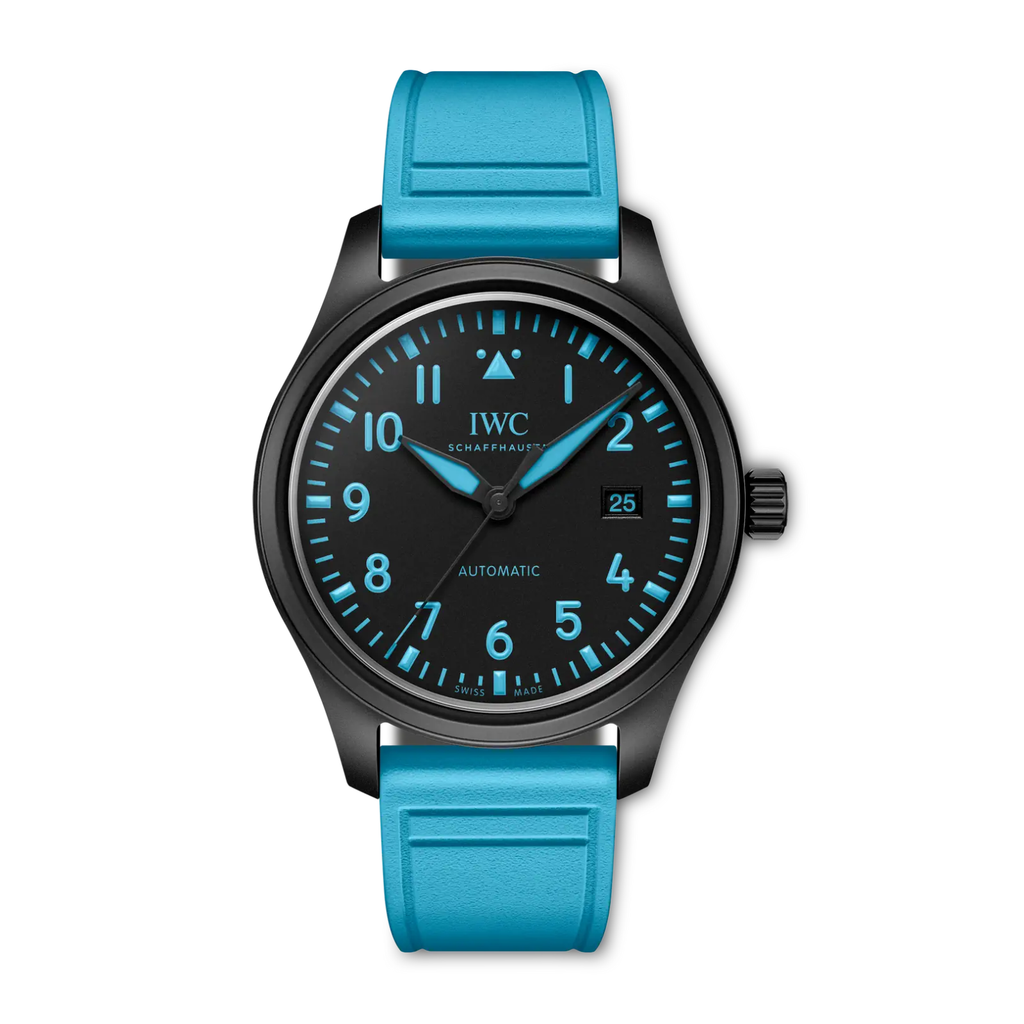 Limited to 1063 pieces, the Pilot’s Watch Automatic 41 George Russell in black ceramic features dial printing and a rubber strap in a unique blue hue inspired by the driver’s racing helmet.