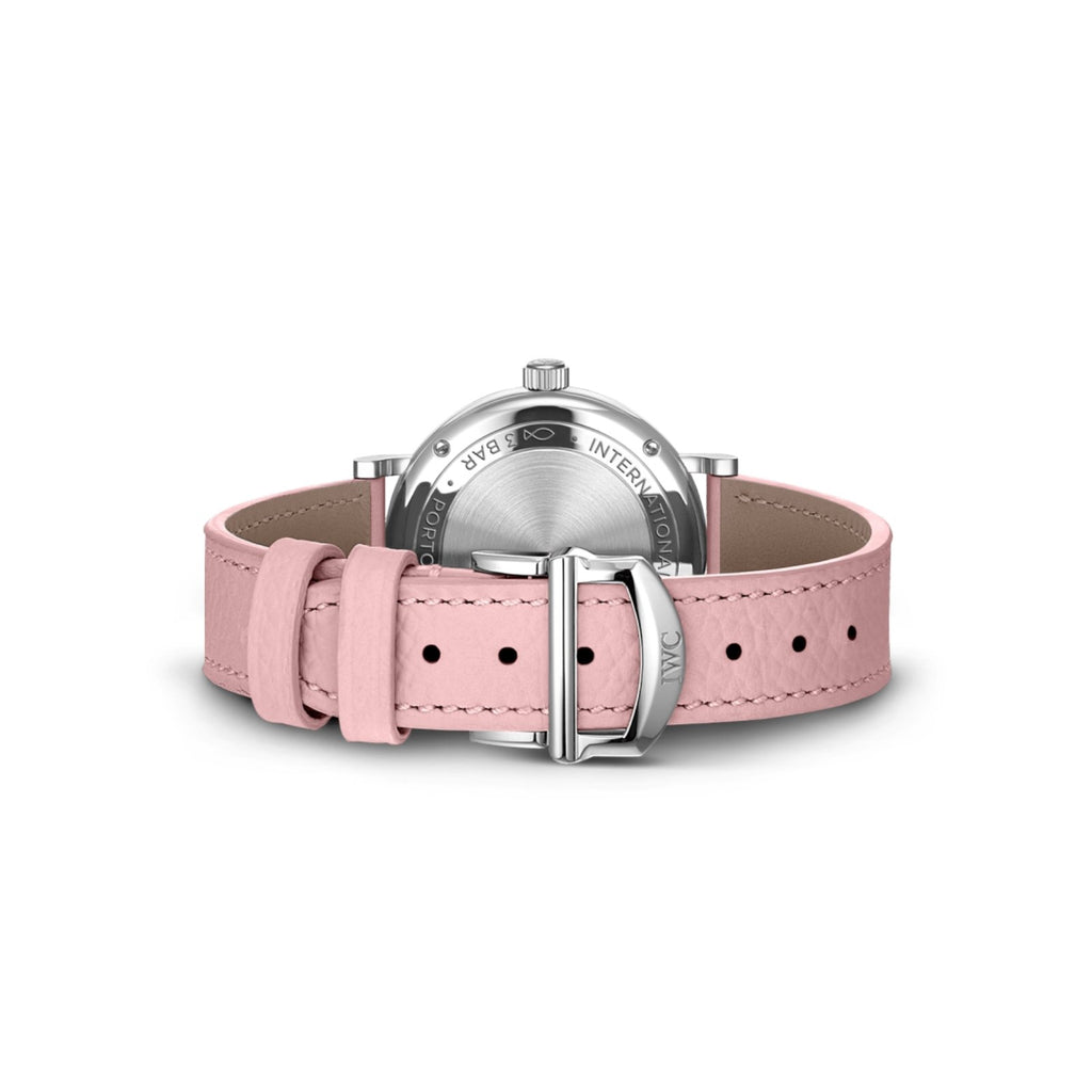 Stainless steel case, Automatic, self-winding, Diameter 34.0 mm, Pink calfskin strap with quick-change system, Strap width 16.0 mm.
