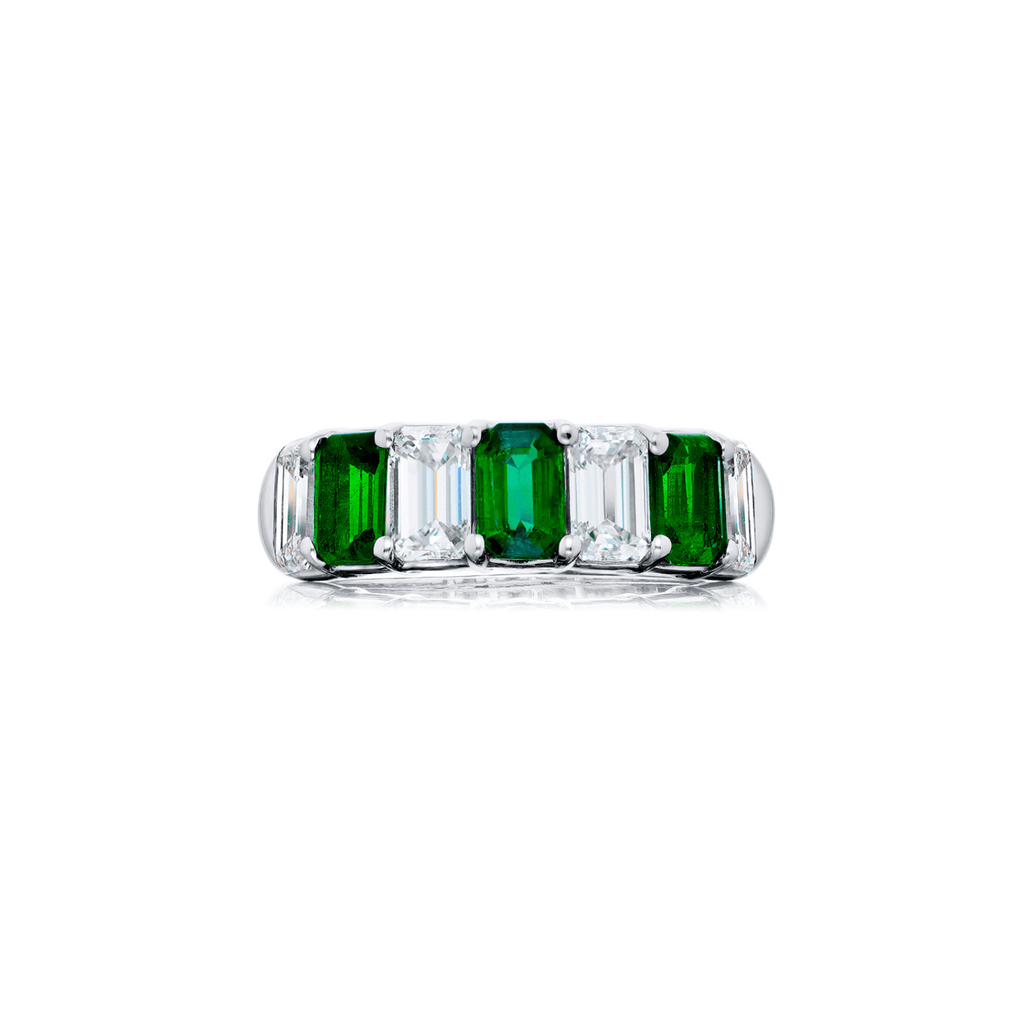 Made with platinum emerald diamond band. Emeralds totaling 1.22 carat weight. Diamonds totaling 2 carats.