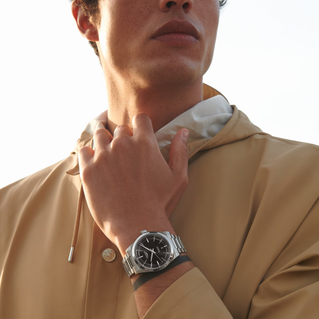 41mm stainless steel case, sunray black dial. Date display. Water resistance of 10 bar. Automatic movement, power reserve of 72 hours. Stainless steel bracelet