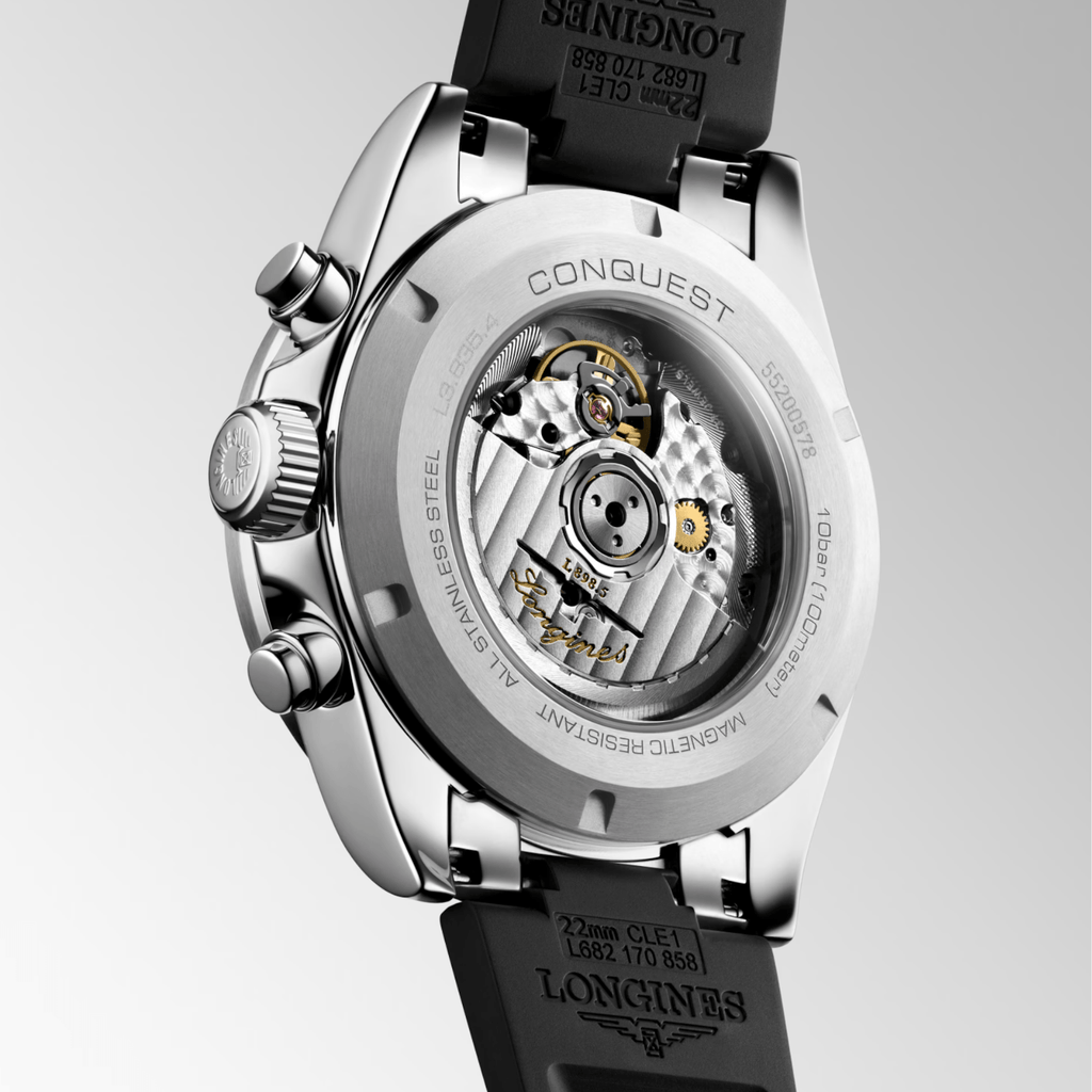 The Longines Conquest boasts a 42mm stainless steel case with a ceramic bezel, complemented by a brown dial featuring black counters. Equipped with an automatic movement, it offers an impressive power reserve of 59 hours. Completing the design is a durable rubber strap.