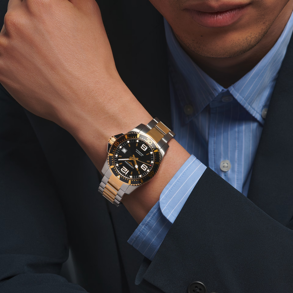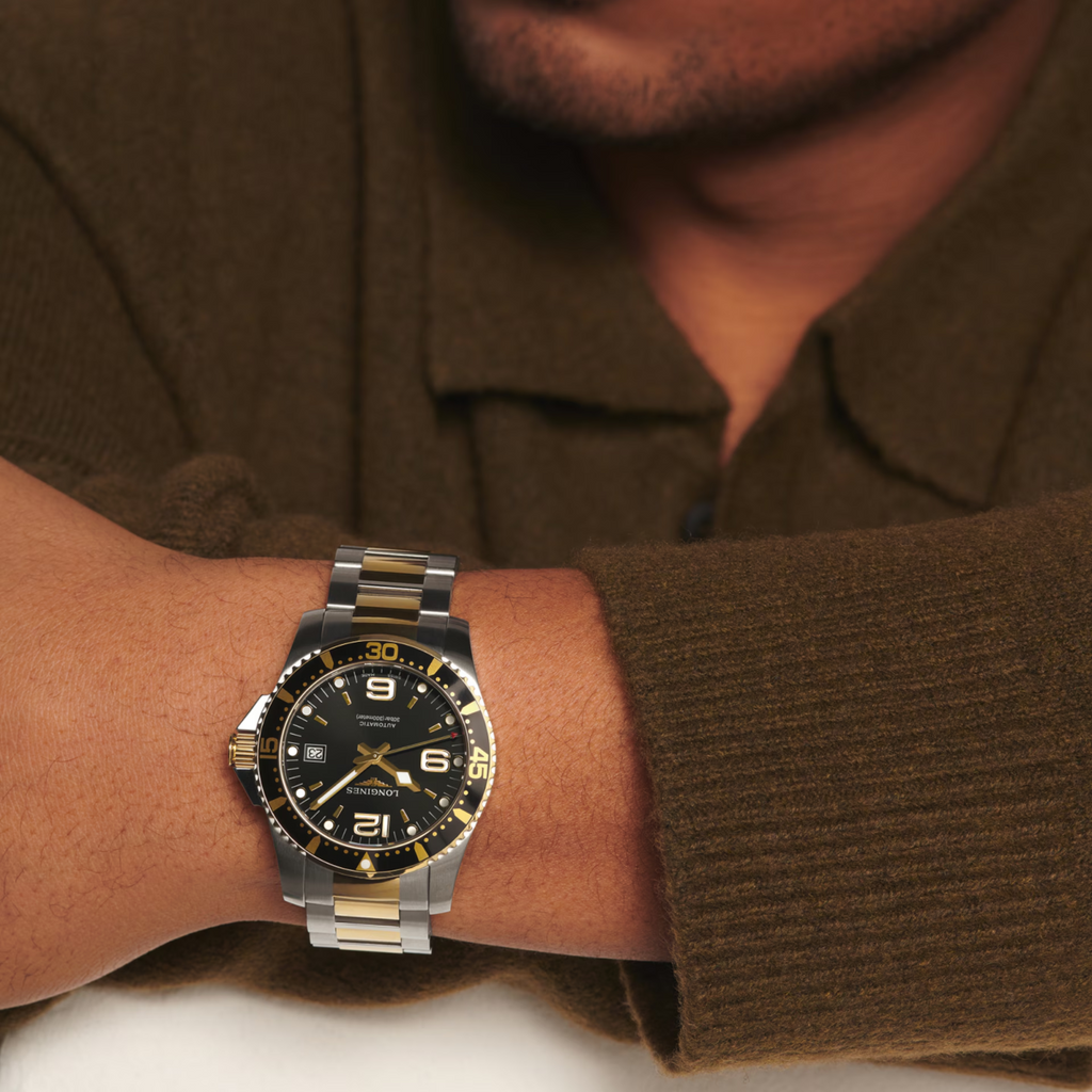 Inspired by the world of water sports, the HydroConquest collection stands out with its daring design. Water-resistant up to 30 bar (300 m) with a unidirectional rotating bezel and screw-down crown and case back, it guarantees exceptional reliability at all times.