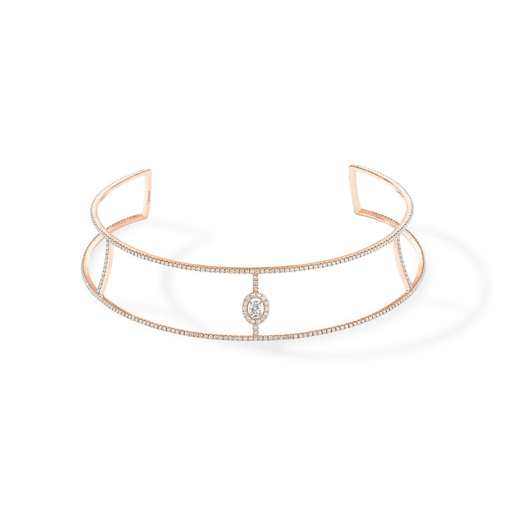 The pink gold is very trendy these last years as it prevailed in luxury jewelry. Its luminous and original color will be favored by the women who seek for a unique diamond jewel. A precious tattoo of gold and diamonds. To materialize the designer's bold vision of a pink gold pavé diamond necklace to put on like a scarf, both creativeness and know-how of the Messika's craftsmen were needed. The Skinny concept developed in our ateliers, provides a precious flexibility to this 18 carat pink gold diamond choker necklace that easily fits the neck. In this version, two choker necklaces like two flickers of light are linked by an oval cut diamond, enhanced by an entourage of brilliant cut diamonds. Structured, luminous, this pink gold pavé diamond choker necklace is a second skin. Fall for this unique diamond jewel: a pink gold diamond choker necklace that praises the proud and glamorous woman.
