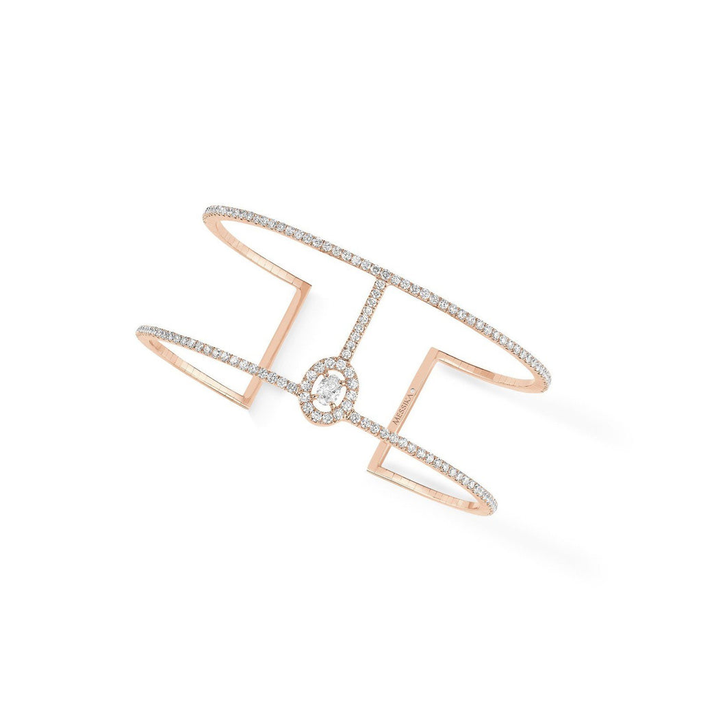 A precious tattoo of gold and diamonds. To materialize its designer's bold vision, both creativeness and know-how of the Messika's craftsmen were needed. The Skinny concept developed in our ateliers, provides a precious flexibility to this 18 carat pink gold diamond cuff bracelet that easily fits the wrist. In this pink gold cuff pavé diamond bracelet version, two threads of diamonds are linked to an oval cut diamond, enhanced by an entourage of brilliant cut diamonds. The shimmering pink gold, created by Messika luxury jewelry House, enlightens the wrist with a soft glow. Structured, luminous, this second-skin diamond bracelet dresses up the wrist with preciousness and reveals the skin, in a delicate spirit of contemporary luxury. Brilliant ! Let be seduced by the radiant shine of the pink gold diamond cuff braelet Glam'Azone!