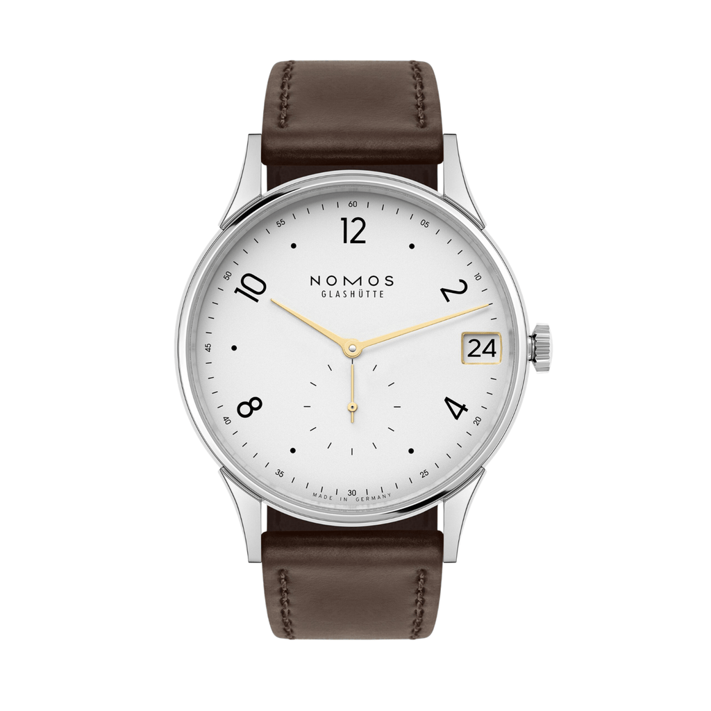 The multiple prizewinning design classic from Glashütte with a hand-wound caliber and patented power reserve indicator that reminds the wearer when to rewind the watch. German efficiency! Another NOMOS patent: the extra-large date. The date ring is set around the...