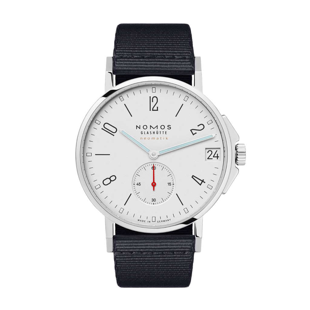 The NOMOS Glashütte Ahoi Neomatik 38 Date features a robust 38mm stainless steel case paired with a white silver-plated dial, combining elegance and durability. Powered by an automatic movement, it offers a 42-hour power reserve for reliable performance. The watch includes a small seconds display for precise timekeeping and boasts water resistance up to 20 atm, suitable for active lifestyles. Completed with a blue-black textile strap, this timepiece balances sophisticated design with rugged functionality.