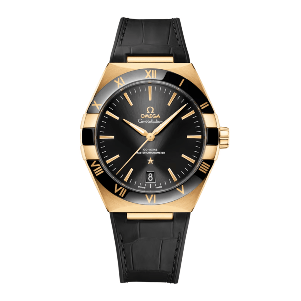 This 41 mm 18K yellow gold model showcases a polished black ceramic bezel detailed with Roman numerals in Ceragold™, a sun-brushed black dial, and a date window at the 6 o'clock position. The hour and minute hands, as well as the OMEGA logo, Constellation star, and faceted indexes, are all crafted in 18K yellow gold. It is complemented by a black leather strap with rubber lining and powered by the OMEGA Co-Axial Master Chronometer Calibre 8901, which can be seen through the scratch-resistant sapphire crystal dome.