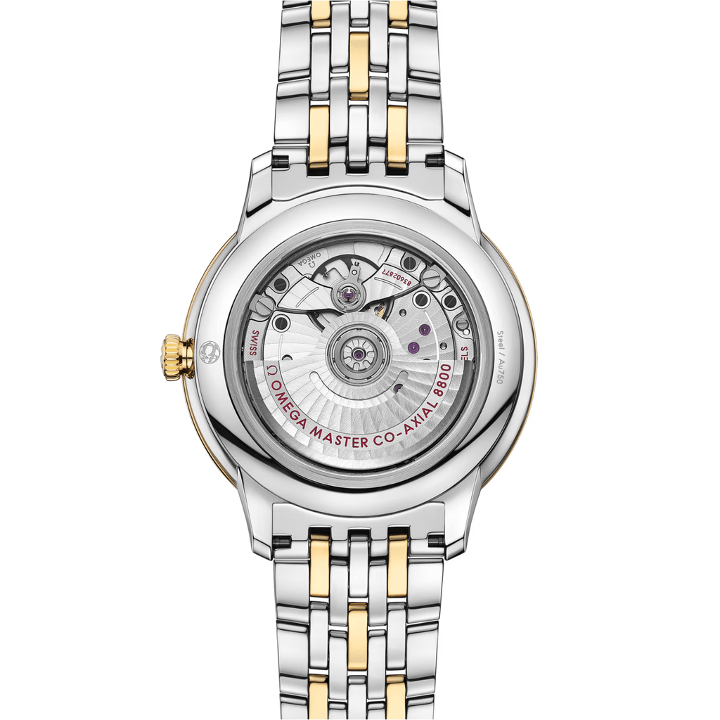 This 40 mm model combines stainless steel with 18K yellow gold, showcasing a flat silvery dial adorned with a sun-brushed, randomly stamped vertical pattern. Yellow gold-plated hands complement the alternating Roman numerals and diamond hour markers. The design is refined with a date window at 6 o’clock and a railway-style minute track encircling the dial. Certified as a Master Chronometer, the watch is powered by the OMEGA Master Co-Axial Calibre 8800, visible through the scratch-resistant sapphire crystal caseback, and secured by a matching stainless steel and yellow gold bracelet.