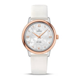 This model features a silvery diamond-set dial with a unique butterfly pattern achieved using a ramolayage, or "pounced ornament", technique. The 18K red gold bezel is mounted on a 32.7 mm stainless steel casebody and presented on a white satin-brushed leather strap. At the heart of this De Ville Prestige "Butterfly" is the OMEGA quartz calibre 4061.
