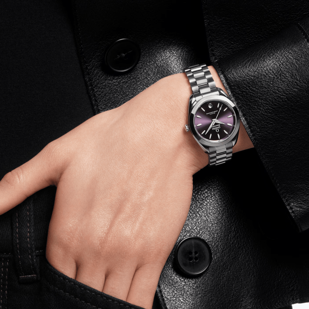This Omega Seamaster Aqua Terra features a 30mm stainless steel case paired with a purple dial. It offers water resistance up to 15 bar and is powered by an automatic movement with a 48-hour power reserve. The watch includes a date function and is secured by a stainless steel bracelet.