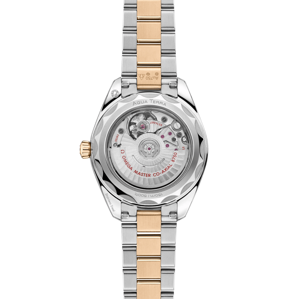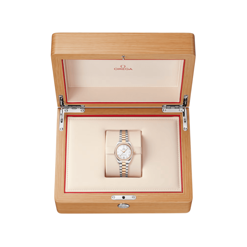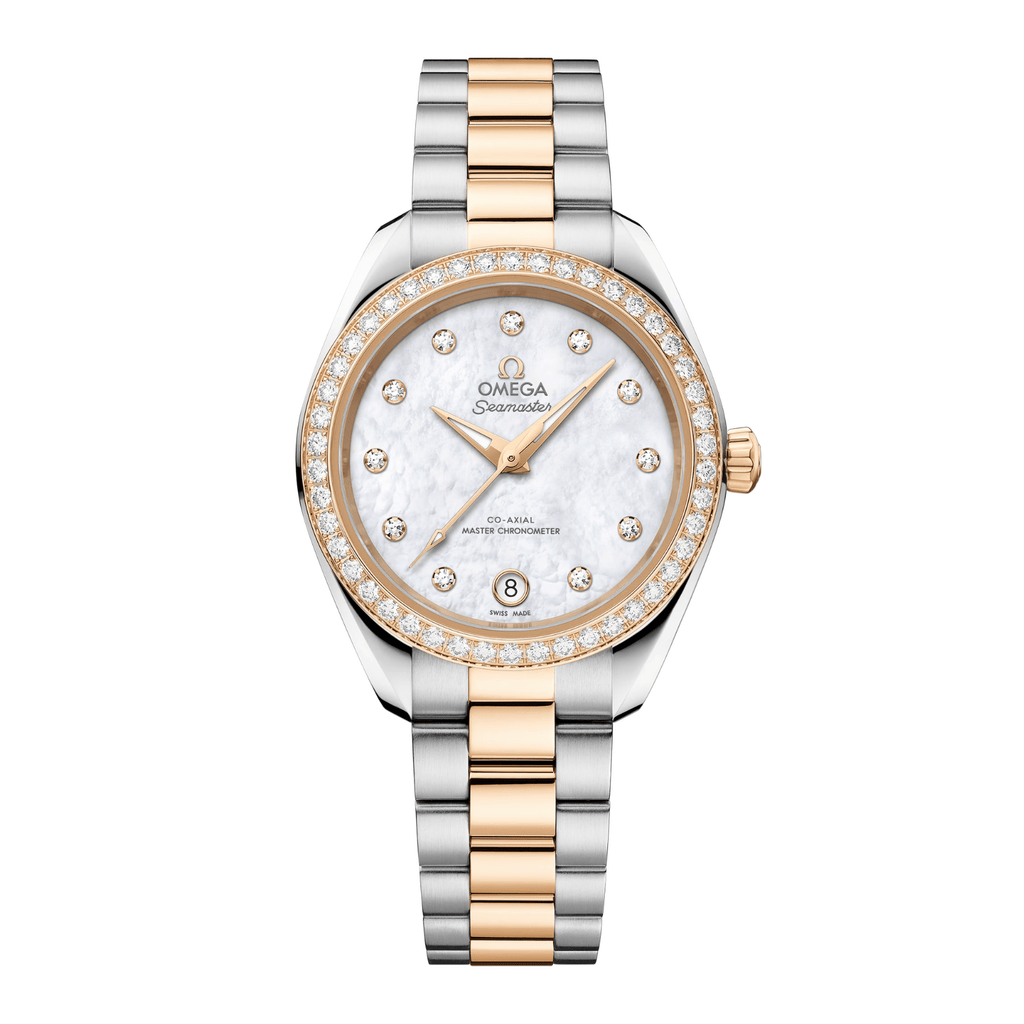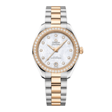 This Omega Seamaster Aqua Terra features a 30mm stainless steel case with Moonshine™ gold diamond bezel paired with a mother-of-pearl dial with diamond markers. It offers water resistance up to 15 bar and is powered by an automatic movement with a 48-hour power reserve. The watch includes a date function and is secured by a stainless steel and Moonshine™ gold bracelet.
