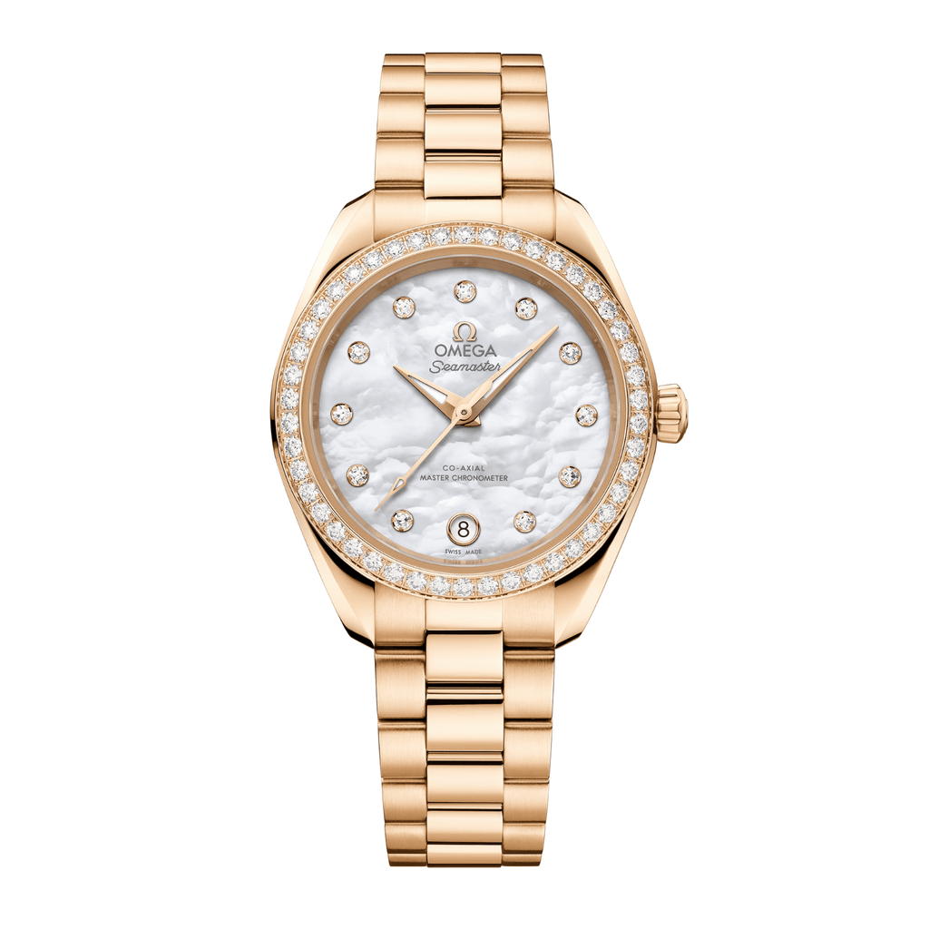 This Omega Seamaster Aqua Terra features a 30mm Moonshine™ gold diamond bezel paired with a mother-of-pearl dial with diamond markers. It offers water resistance up to 15 bar and is powered by an automatic movement with a 48-hour power reserve. The watch includes a date function and is secured by a Moonshine™ gold bracelet.