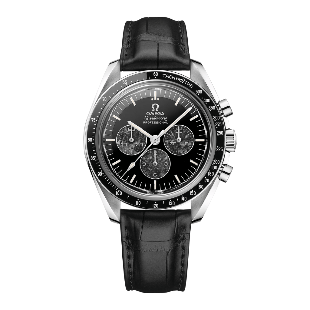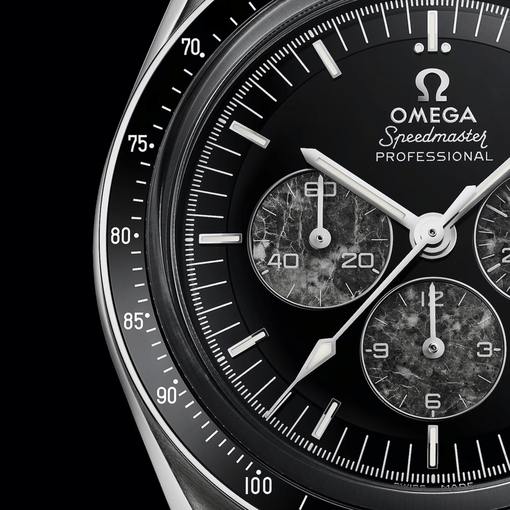 The design also includes a black ceramic bezel with a white enamel tachymeter scale. Most notable is the step dial in black onyx, which uses 18K white gold for the indexes, and most hands. The vintage OMEGA logo is in 18K white gold. The design is completed by three unique subdials formed from a lunar meteorite, the same used for the Speedmaster Apollo 11 50th Anniversary Limited Edition in Moonshine Gold™.
