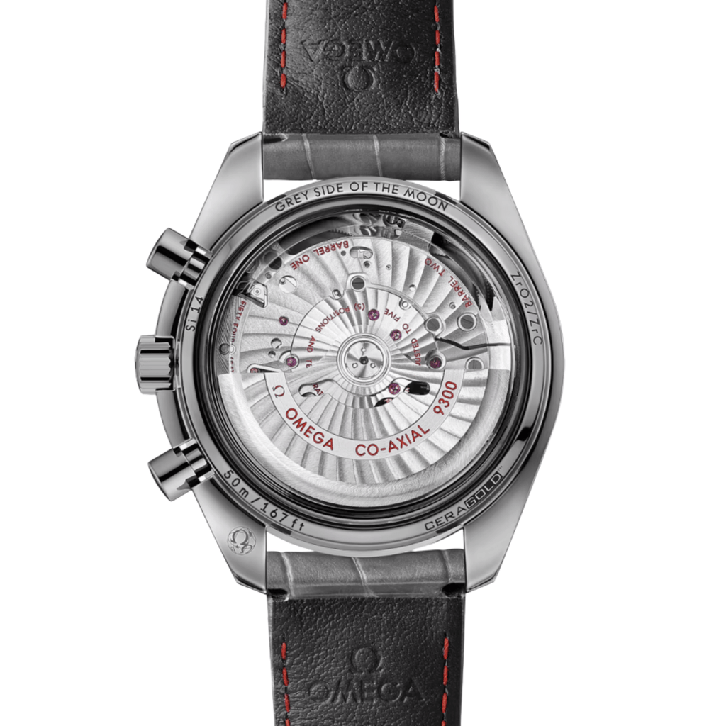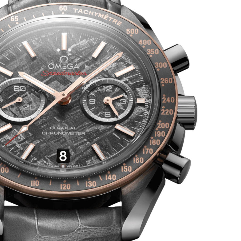 OMEGA’s Speedmaster Grey Side of the Moon "Meteorite" is an innovative addition to the Speedmaster collection. This timepiece is not only ready for adventure but is also stylish beyond compare. The grey ceramic case is complemented by 18K Sedna™ gold Moonwatch-style hands and an 18K Sedna™ gold bezel with a silicon nitride ring and brushed OMEGA Ceragold™ tachymeter scale. The Meteorite dial is made from a solid piece of ancient, extra-terrestrial stone that has been acid etched to reveal a unique pattern on each watch. Reminiscent of its legendary predecessors, the Speedmaster Grey Side of the Moon "Meteorite" has a 60-minute and 12-hour recorder at 3 o’clock and a small seconds sub-dial at 9 o’clock. OMEGA’s Co-Axial calibre 9300 can be seen through the bevelled sapphire crystal caseback. It is presented on a grey leather strap with a titanium foldover clasp.