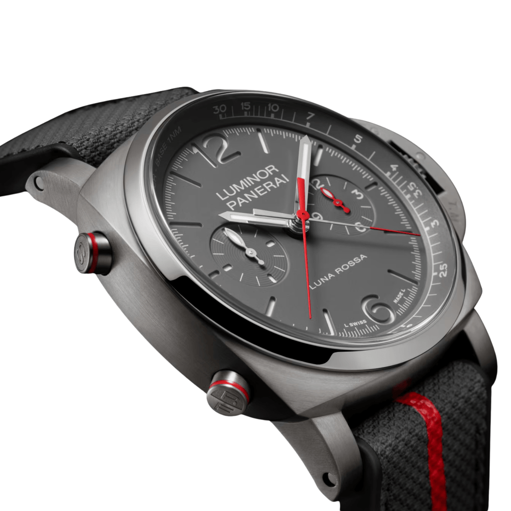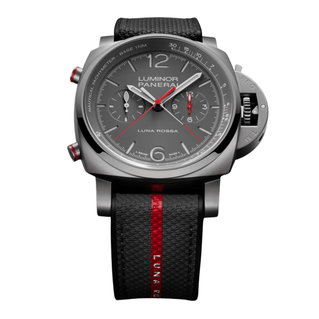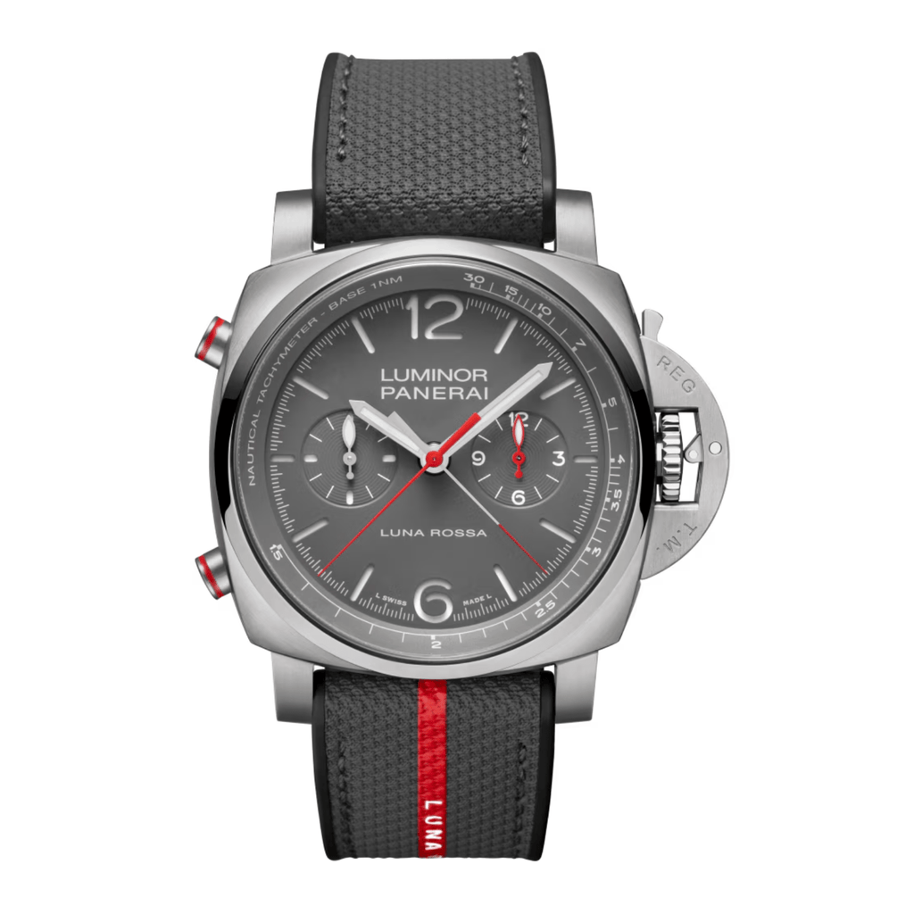 This Panerai Luminor Chrono Flyback Luna Rossa features a 44mm brushed titanium case and is powered by the automatic mechanical P.9100 calibre, measuring 13¾ lignes and 8.15mm in thick, with 37 jewels, Glucydur® balance, and a frequency of 28,800 per hour. It includes an Incabloc® anti-shock device and a 3-day power reserve from two barrels, composed of 302 components
