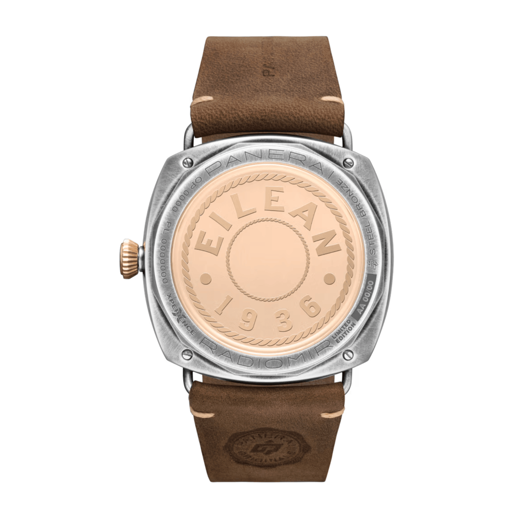 Featuring a 45mm steel and bronze case, this watch boasts a sophisticated beige dial with luminous Arabic numerals and hour markers. Small seconds are located at 9 o'clock, while the hand-wound mechanical P.5000 calibre, with 15 ½ lignes, 4.5 mm thickness, 21 jewels, Glucydur® balance, and 21,600 alternations per hour, guarantees precision. Equipped with an Incabloc Parechoc® anti-shock device, this timepiece has a remarkable power reserve of 8 days and two barrels, made up of 146 components. It also has a water resistance of 10 bar and is completed with a dark brown calf leather strap.