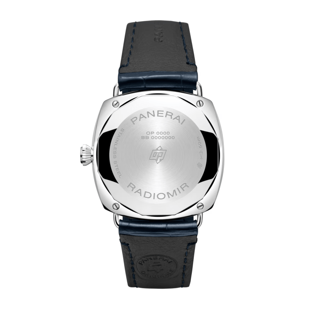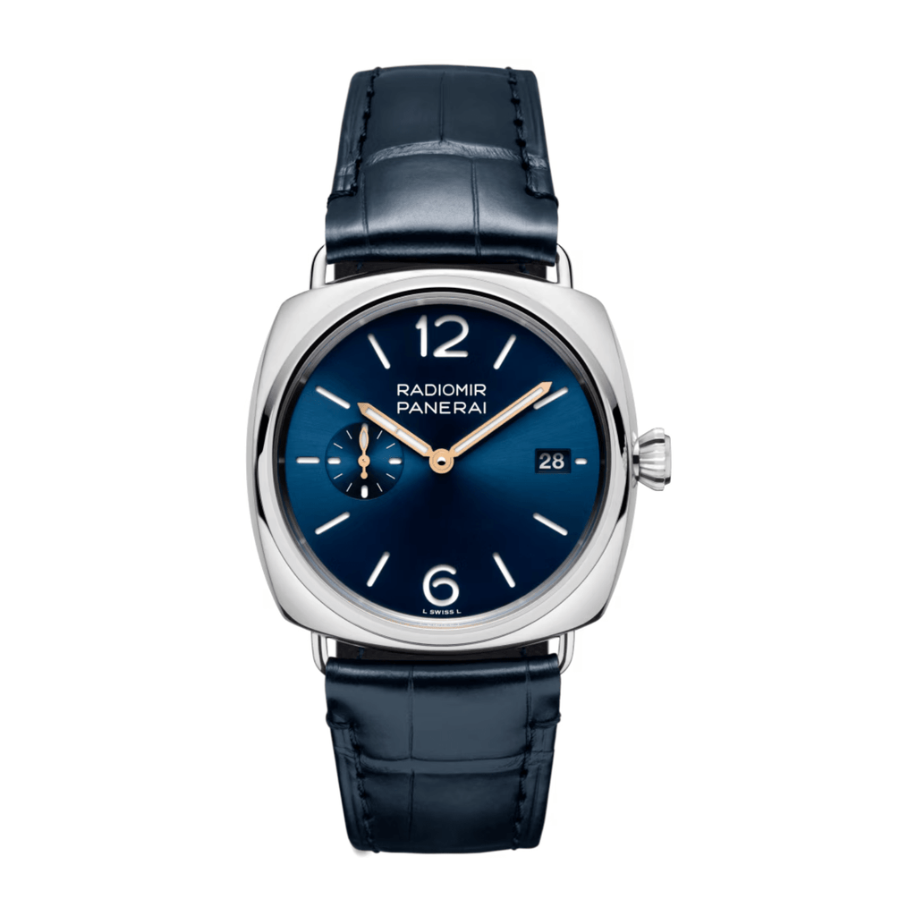 Panerai Radiomir Quaranta in a 40mm stainless steel case with blue dial on blue alligator strap, featuring a small seconds, a date display, and an automatic movement with up to 3 days of power reserve.