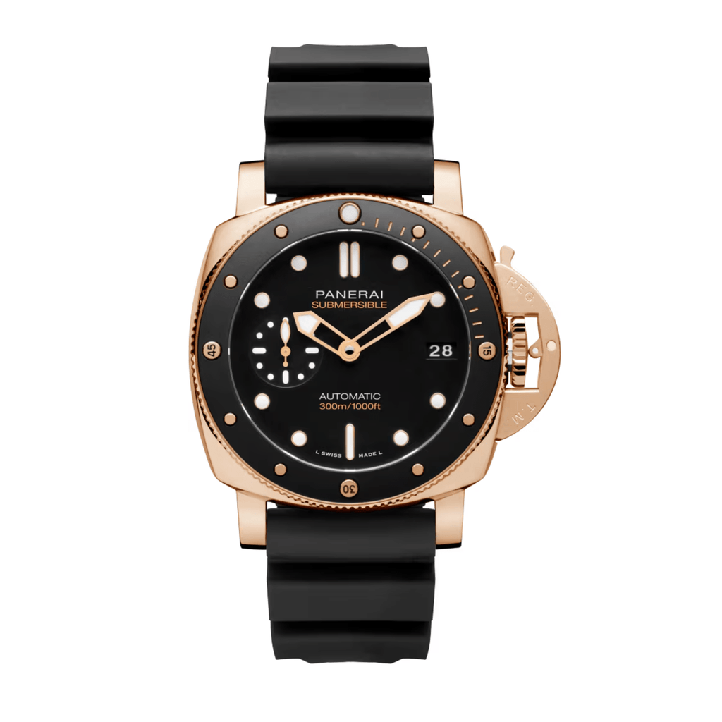 The Panerai Submersible 42mm features an automatic mechanical P.900 calibre movement, measuring 12 ½ lignes and 4.2 mm in thickness, with 23 jewels and a frequency of 28,800 vibrations per hour. It incorporates the Incabloc® anti-shock system and offers a three-day power reserve powered by a single barrel. Comprising 171 components, the movement includes a calendar aperture. The watch showcases a polished Panerai Goldtech™ 42mm case, complemented by a black dial with luminous hour markers and dots. Additional functions include a date display at 3 o'clock and a small seconds counter at 9 o'clock. It is water resistant up to 30 bar and comes with a black caoutchouc rubber strap.