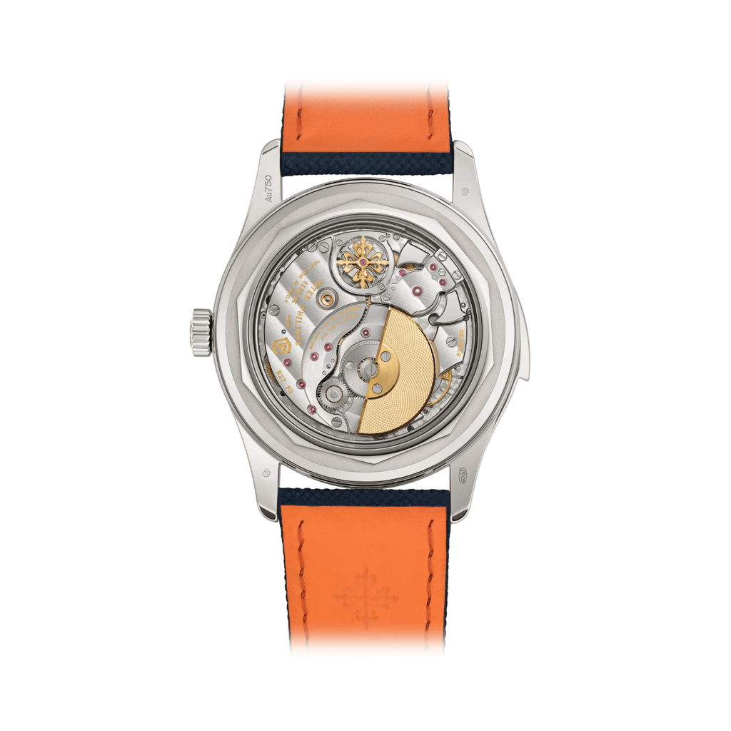 Patek Philippe revisits its split-seconds chronograph with perpetual calendar by treating it to a white gold case and a sunburst navy blue dial. The navy-blue composite strap with a fabric pattern and contrasting red stitching brings an undeniably sporty look...