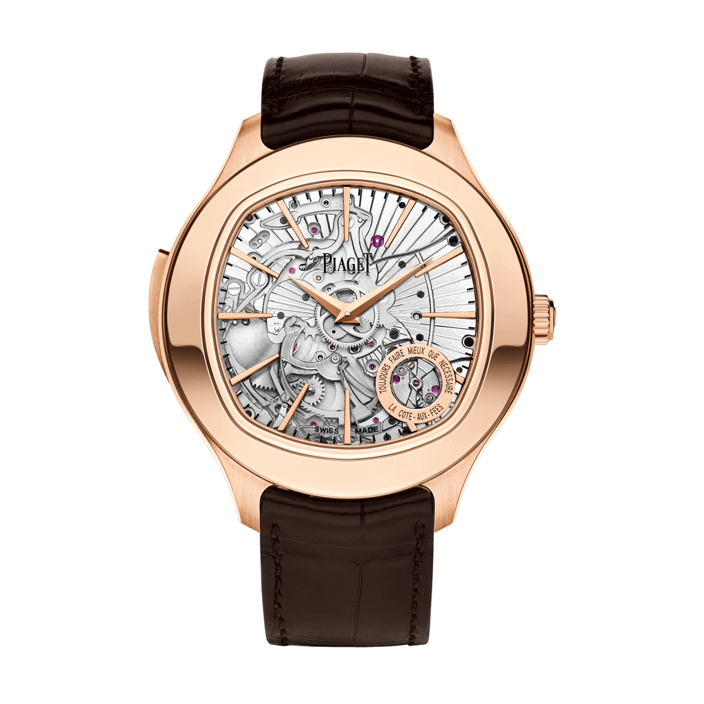 The Piaget Polo Emperador cushion-shaped automatic minute repeater attains a double record for thinness in its category: 4.8 mm for the movement and 9.3 mm for the case. Its extraordinarily pure and intense gong, embracing three virtually-harmonic partials, brilliantly heralds Piaget’s arrival in the world of minute repeaters. This timepiece meets a threefold objective: uncompromising technical mastery, the finest acoustics and esthetics focused on exceptional finishes. The case, which is in perfect harmony with the complication, features wisely-orchestrated architecture that highlights the structure of the cushion and rounded shapes – the genuine hallmark of Black Tie luxury watches. This ever-so-refined masterpiece, which epitomizes the pure harmony of watchmaking art, incomparable thinness and exceptional design, perpetuates Piaget’s unwritten rule of excellence.