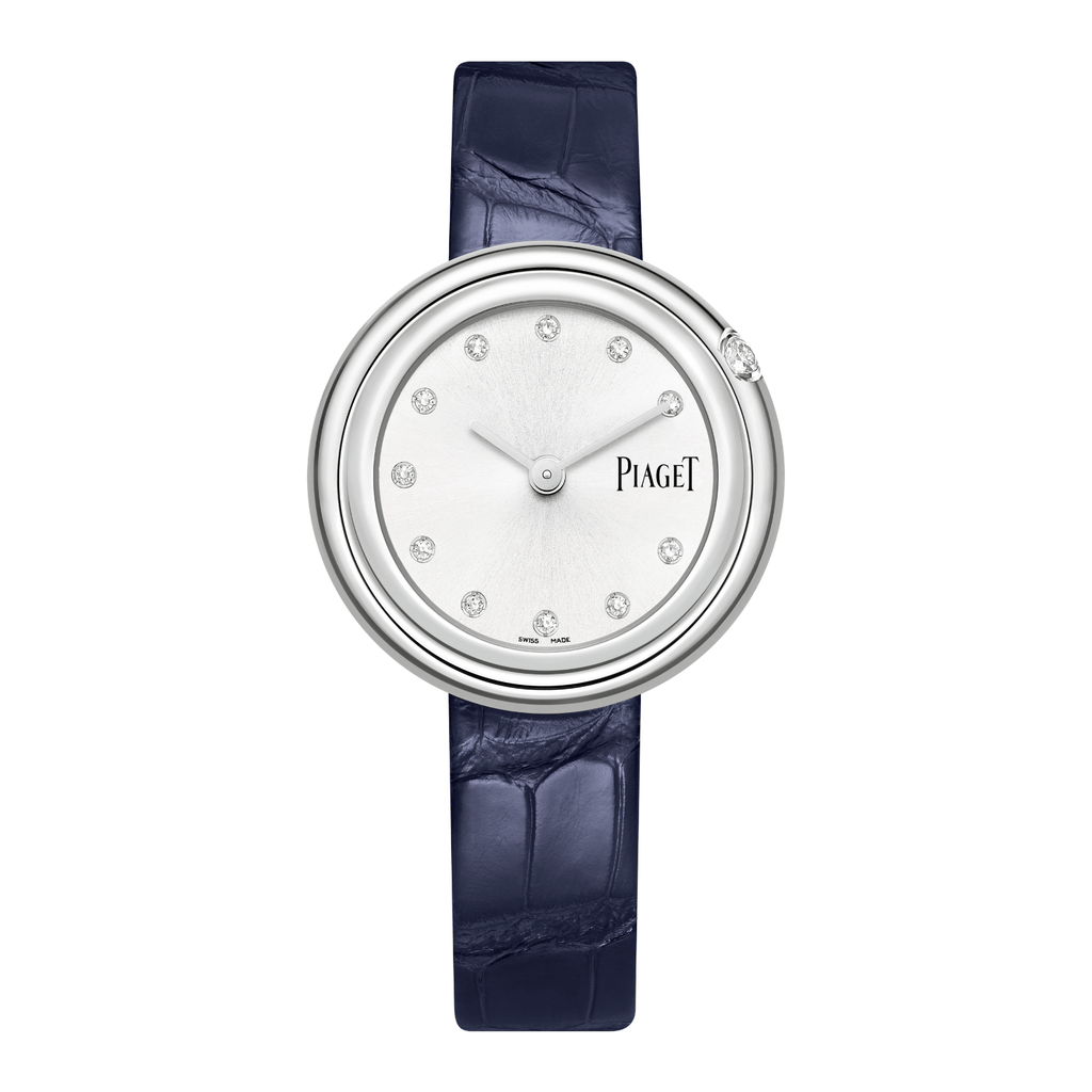Possession watch, 34 mm. Case in steel set with one brilliant-cut diamond (approx. 0.06 ct). Dial set with 11 brilliant-cut diamonds (approx. 0.09 ct). Interchangeable light blue alligator strap. Piaget 358P quartz movement.