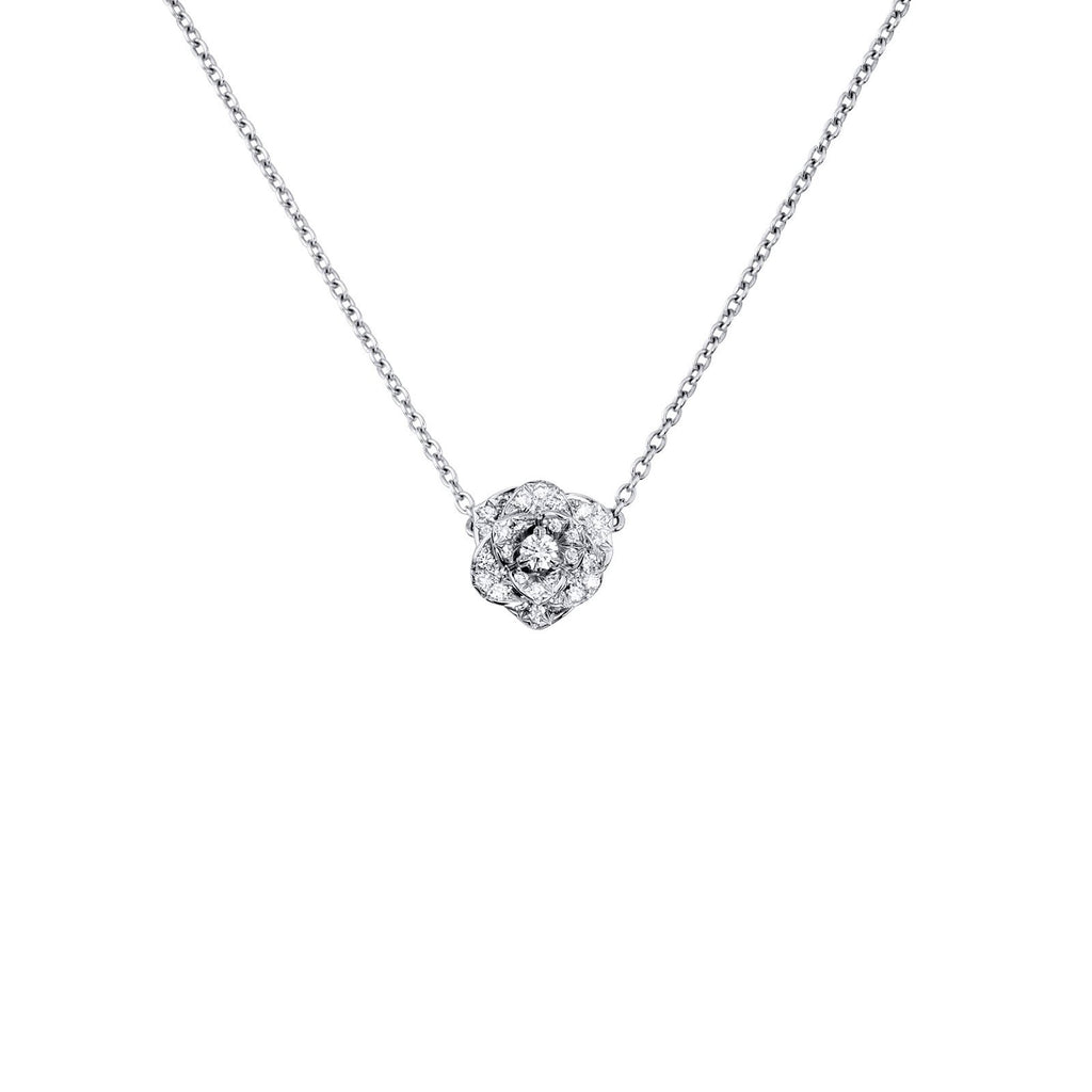 This romantic pendant poetically evokes a tender promise of love. A stylized rosebud inspired by the Yves Piaget rose delicately unfurls its white-gold petals, creating the illusion of a real flower. Garden freshness: the central diamond twinkles as though bathed in dew.