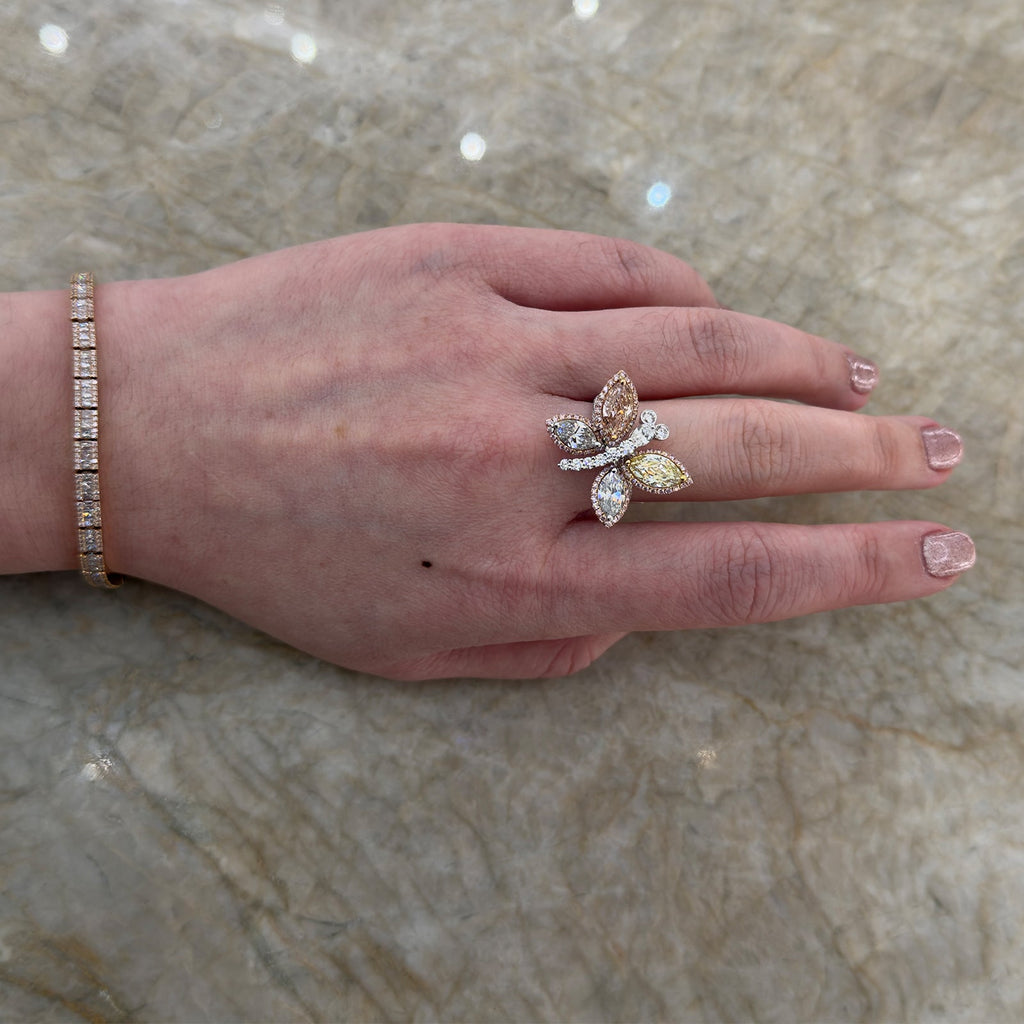 Made with platinum and 18 karat rose gold butterfly colored diamond ring. Diamonds, totaling 2.51 carats. Colored diamonds, totaling 3.02 carats.