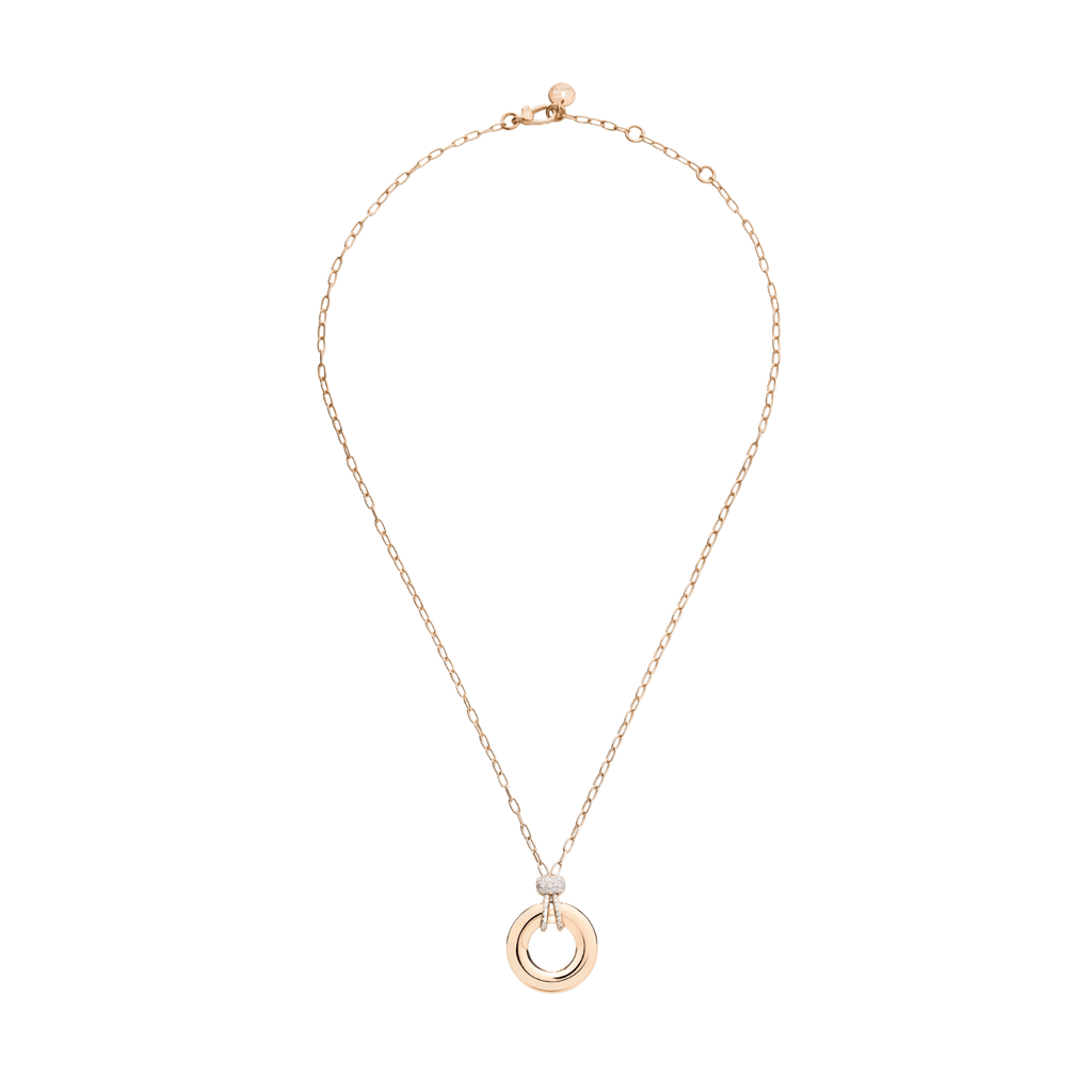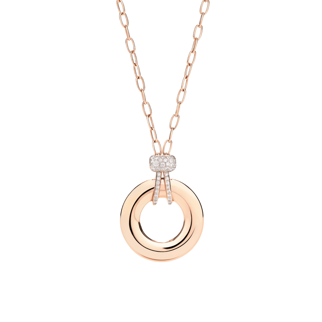 Pomellato Iconica Necklace with Pendant in 18k rose gold with 37 white diamonds (≈0.2 ct) on 18k white rhodium-plated rose gold. Discover the perfect expression of your individuality with the new reversible pendants, two jewels in one: diamonds elegance on one side, pure rose gold on the other.