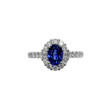 Crafted from 18 karat white gold, this sapphire diamond ring features a 1.08-carat sapphire complemented by diamonds with a combined weight of 0.65 carats.