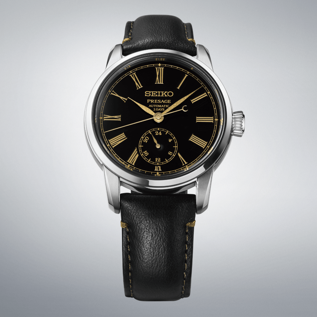 Featuring a 40mm stainless steel case and a black dial, this model includes a small seconds complication. It is powered by an automatic movement with a 72-hour power reserve and complemented by a calfskin strap. The watch offers water resistance up to 10 bar.