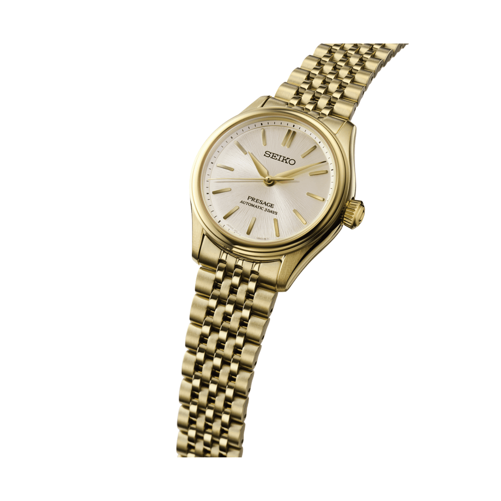 Seiko Presage Cocktail Time SRE018 in 30mm stainless steel case with gold dial on stainless steel bracelet, featuring an automatic movement with up to 40 hours of power reserve.