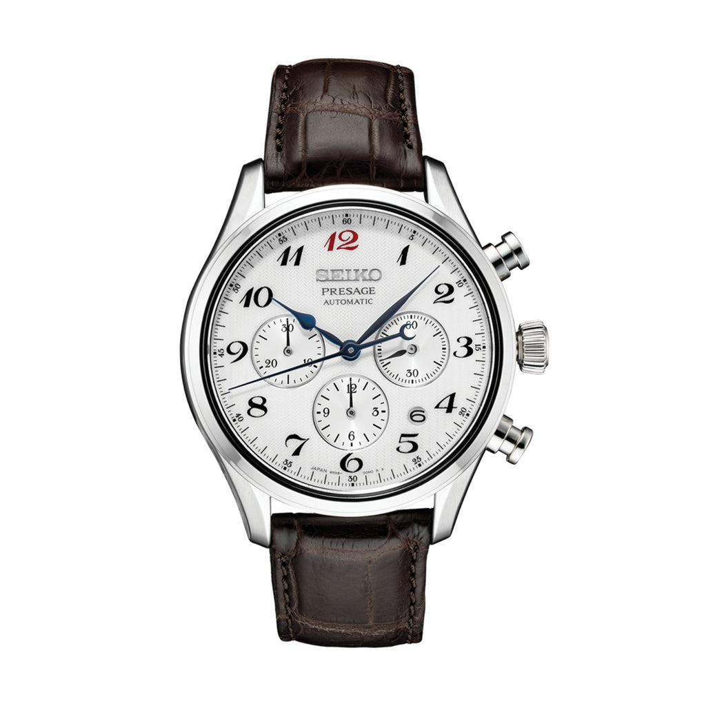 42mm stainless steel case, white dial. Chronograph automatic movement. Date display. Crcodile leather strap. Power reserve of 45 hours. Water-resistance 10 bar.