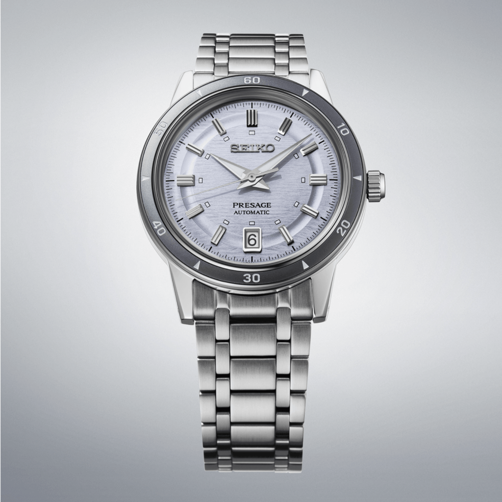 Presage Style60's Collection. Celebrating the fresh spirit of the 1960s, this design is an homage to Seiko’s 1964 “Crown Chronograph,” combining a bold ruggedness with a refined and tailored style. Framed by a metallic bezel with laser engraved details, the...