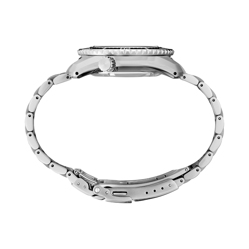 With a 42mm stainless steel case and white dial, this watch boasts a water resistance of 300m. Featuring an automatic movement and a power reserve of 50 hours, it also includes a date display and durable stainless steel bracelet.