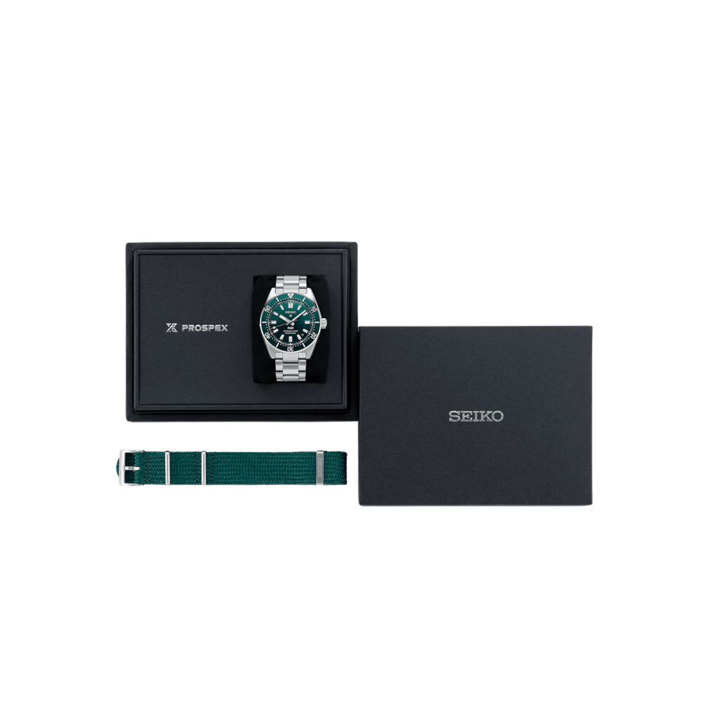A special edition symbolizes the partnership between Prospex and PADI. Infused with a love for the beautiful ocean, it features an emerald-green gradient dial inspired by shimmering light and the rippling surface as seen from underwater. It comes in a 40mm stainless steel case with a unidirectional rotating bezel, paired with a stainless steel bracelet, and is powered by an automatic movement with up to 72 hours of power reserve. The watch also includes a fabric strap made from upcycled fishing nets.