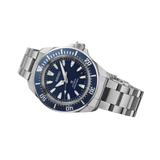 Seiko Prospex a 41.7mm stainless steel case with blue dial on stainless steel bracelet, featuring a unidirectional rotating bezel, a date display, and an automatic movement with up to 41 hours of power reserve.