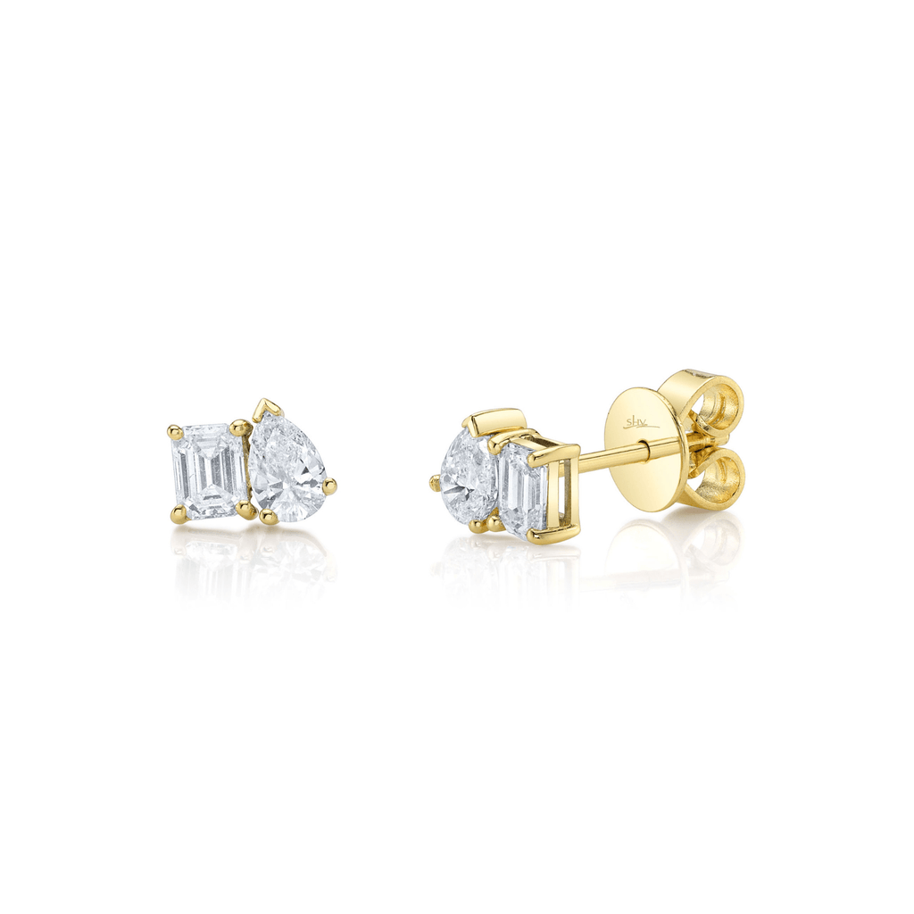 Shy Creation Diamond Emerald Pear Stud Earrings in 14 karat yellow gold with diamonds totaling 0.84 carats.