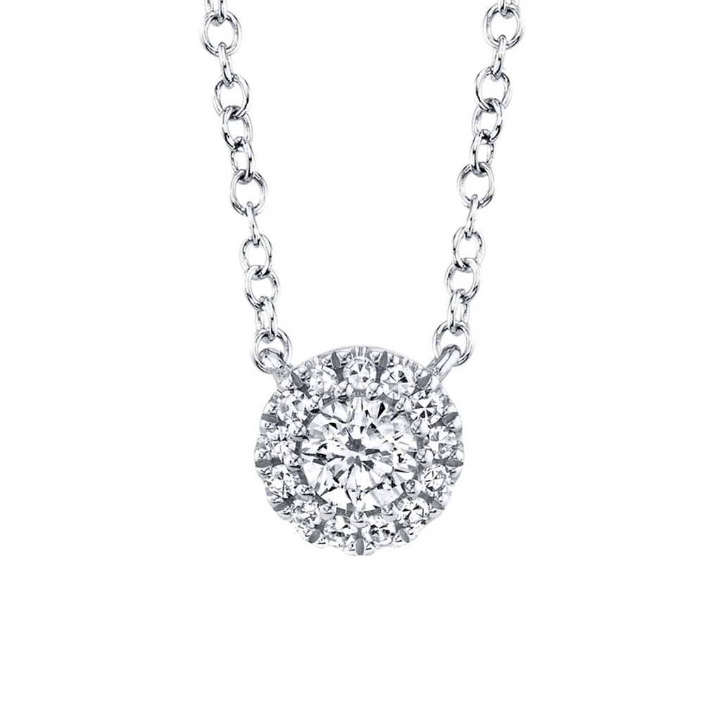 Shy Creation Diamond Halo Necklace in 14 karat white gold with diamonds totaling 0.40 carats.