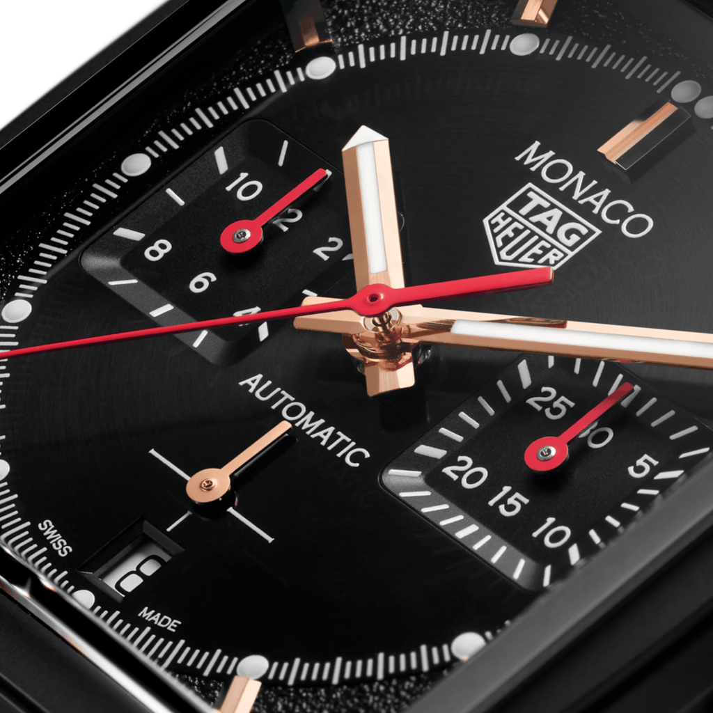 Paying homage to the rare and mythical all-black Monaco of the 70s, this TAG Heuer Monaco Special Edition is a must have for connoisseurs. A fiercely elegant 39mm black DLC titanium case, houses the indomitable manufacture Calibre Heuer 02.