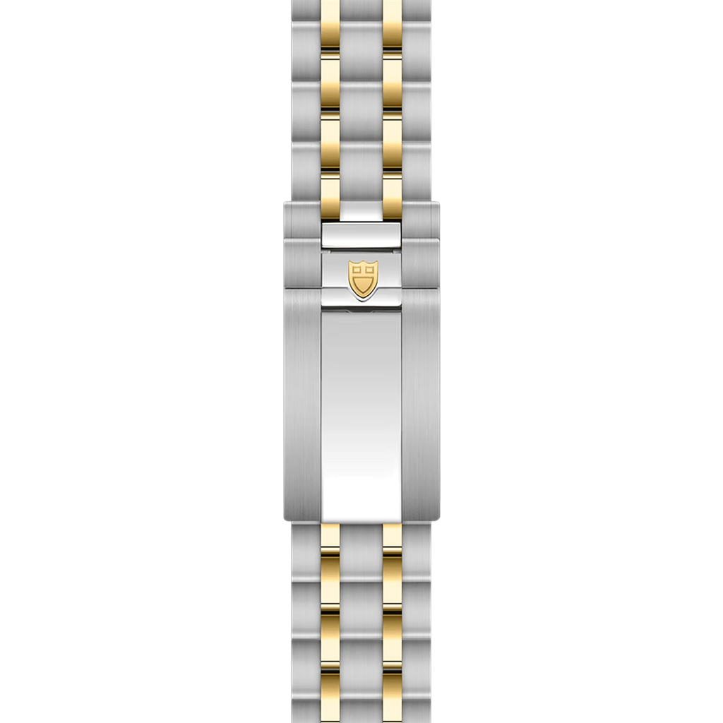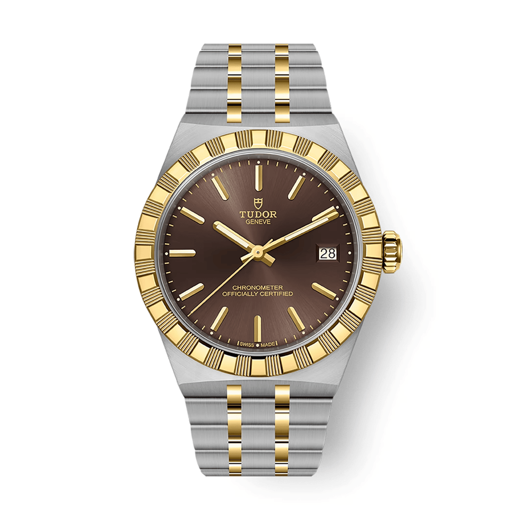 The TUDOR Royal 36mm combines stainless steel and yellow gold in a sophisticated timepiece featuring a polished and satin finish case measuring 36mm with 9.7mm thickness and 9mm lug width. Powered by the Manufacture Calibre MT5412 movement, COSC-certified and tuned to -2/+4 seconds, this self-winding mechanical watch delivers approximately 70 hours of power reserve. The screw-down winding crown is topped with a 0.1mm yellow gold cap bearing the TUDOR logo in relief. Water-resistant to 100m, the watch features a fixed solid yellow gold bezel, brown dial with applied stick hour markers, date window at 3 o'clock, and a scratch-resistant sapphire crystal. The 5-link integrated bracelet in stainless steel showcases center links with a 0.2mm yellow gold cap, secured by a "T-fit" folding clasp with safety catch and solid yellow gold logo detail.