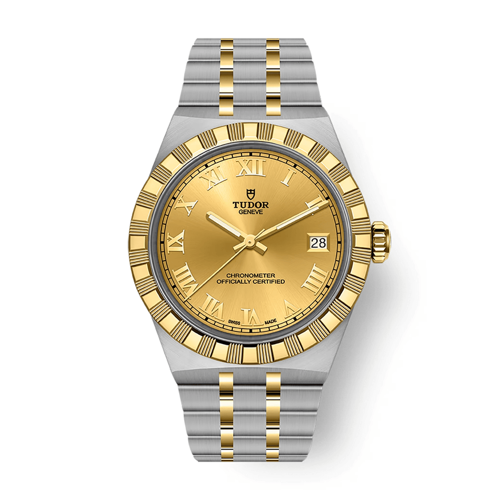 The TUDOR Royal 36mm combines stainless steel and yellow gold in a sophisticated timepiece built for refined elegance. Its 36mm case features polished and satin finishes with a 9mm lug width and 9.7mm thickness, striking the perfect balance between presence and wearability. Powered by the Manufacture Calibre MT5412 movement—COSC-certified and tuned to -2/+4 seconds—this self-winding mechanical watch delivers approximately 70 hours of power reserve. The screw-down winding crown, topped with a 0.1mm yellow gold cap bearing the TUDOR logo, ensures secure operation. A fixed solid yellow gold bezel frames the champagne-colored dial, adorned with applied Roman numerals and a date window at 3 o'clock. Protected by a sapphire crystal and waterproof to 100m, the watch sits on a 5-link integrated bracelet in stainless steel with gold-capped center links, secured by a "T-fit" folding clasp with safety catch and solid yellow gold logo.