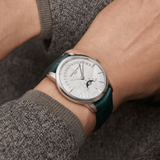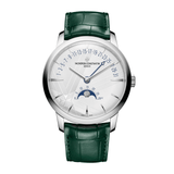 This 42mm white gold case features a Silver-toned dial with the 270th anniversary pattern inspired by the Maltese cross. It also includes a convex external zone, 18K gold moons, retrograde hand-type date, 18K gold bi-faceted baton-type hour/minute hands, and 18K gold applied hour-markers. Additionally, it has a water resistance of 3 bar and an automatic movement with a power reserve of 40 hours. The alligator strap with ardillon buckle provides a sophisticated touch. Other features include hours, minutes, balance-stop, and precision moon phase.