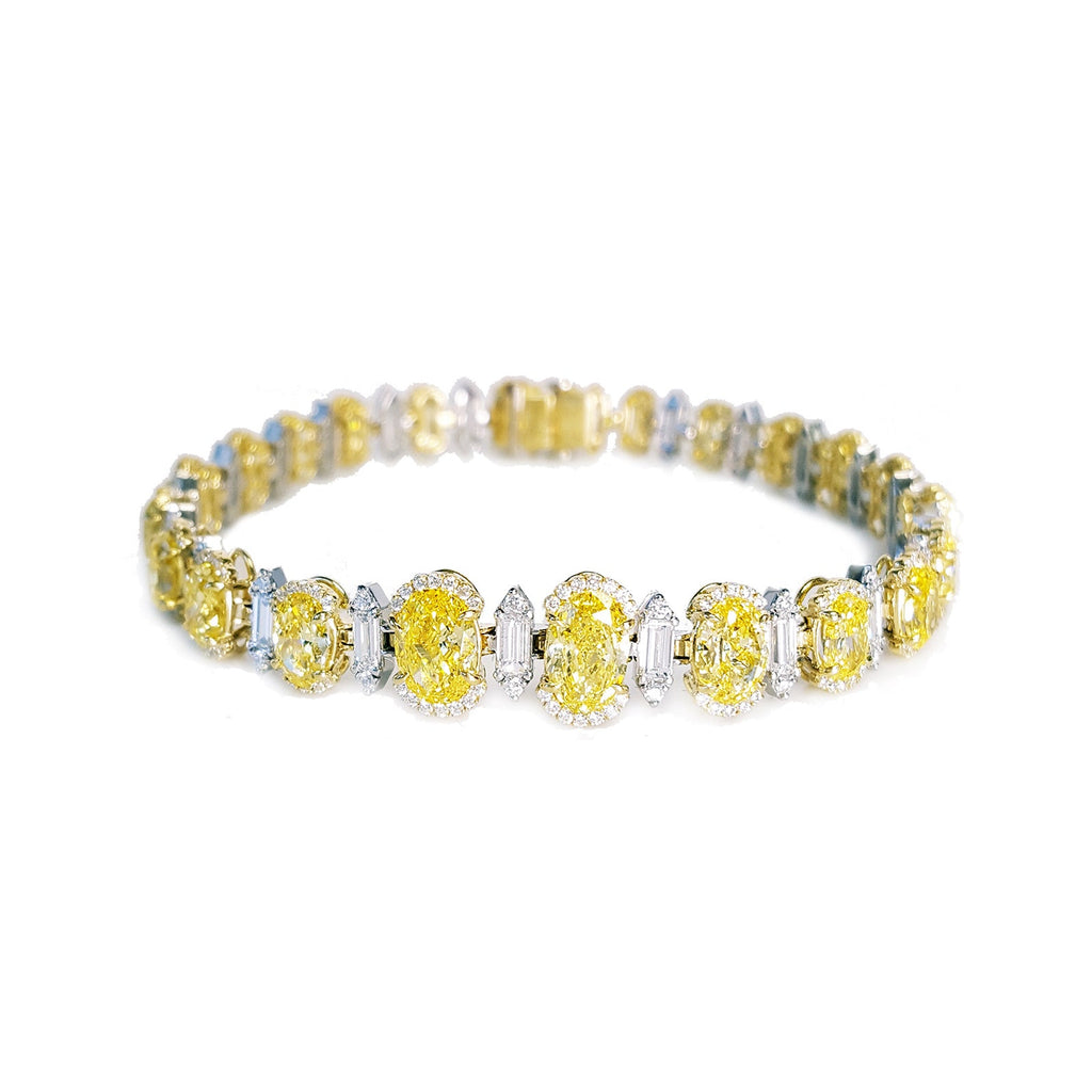Yellow Diamond Bracelet made in 18 karat yellow gold and platinum with oval brilliant cut yellow diamonds totaling 9.26 carats ranging from fancy vivid yellow to fancy intense yellow, and white diamonds totaling 3.13 carats.