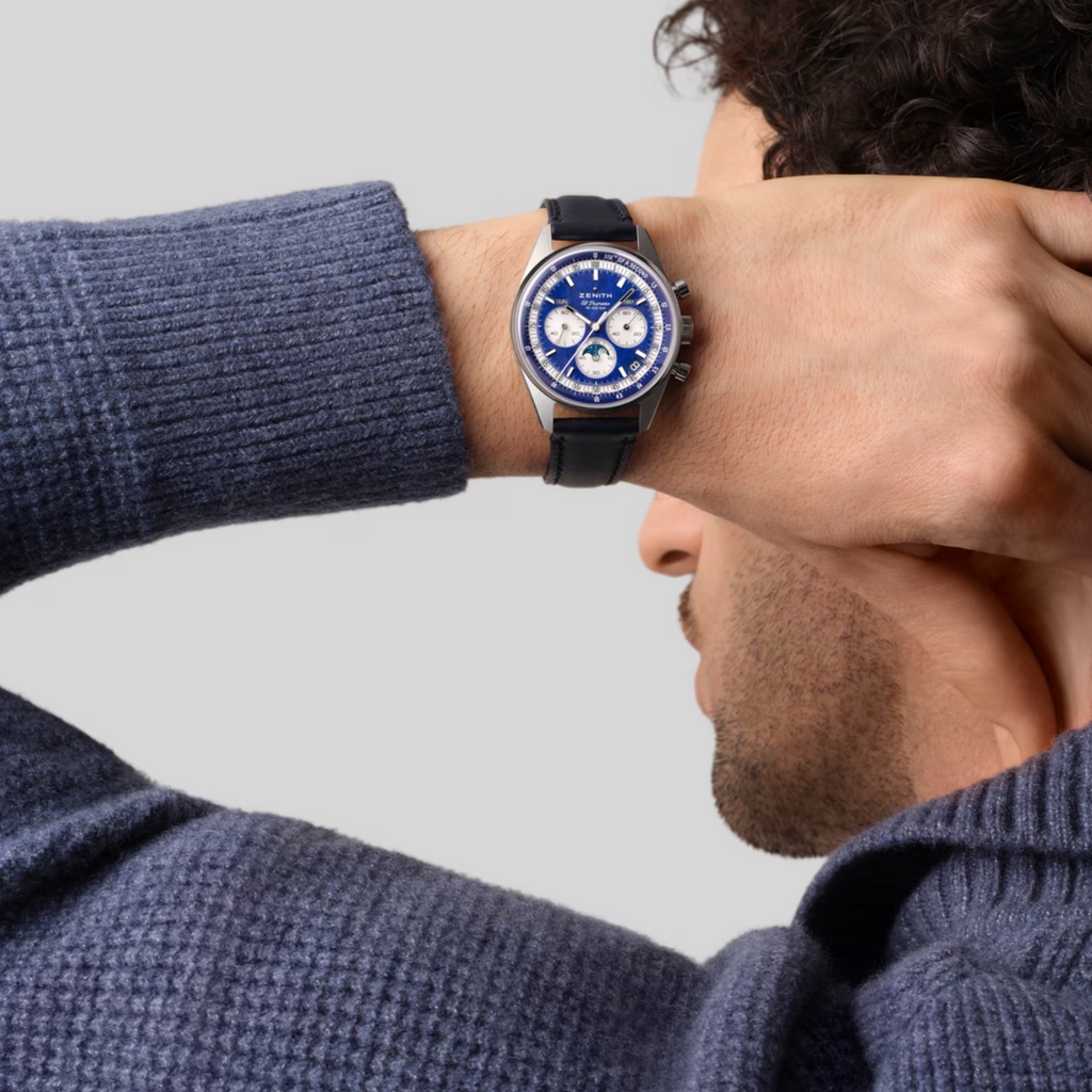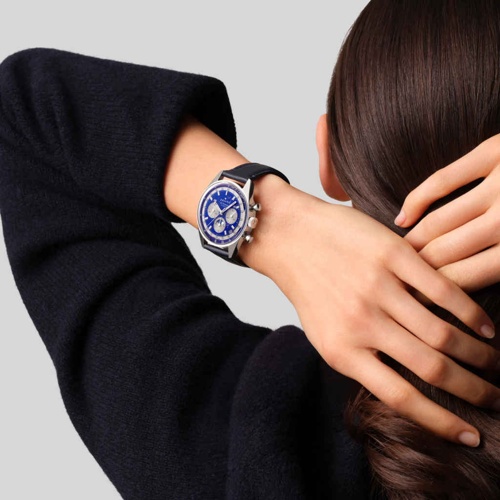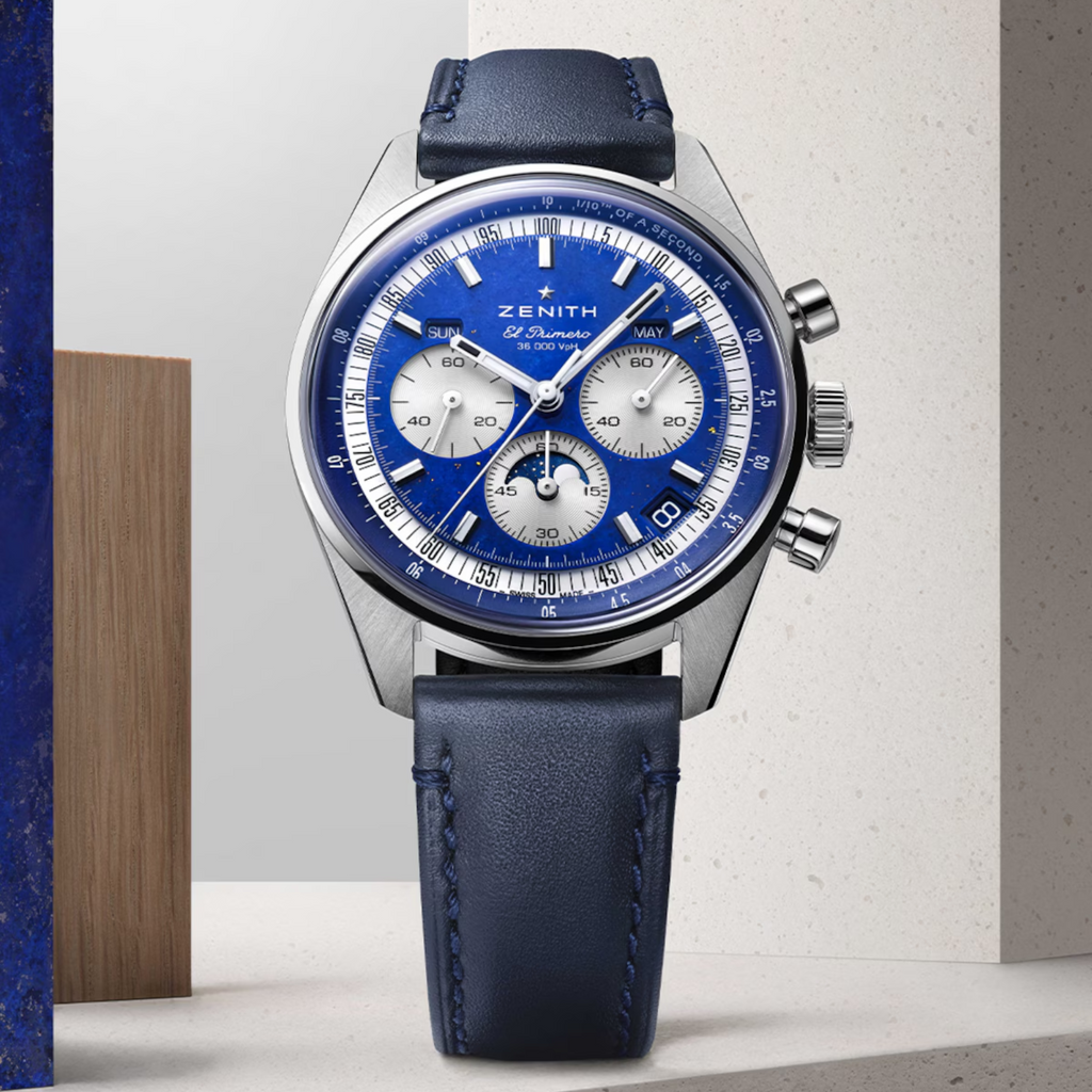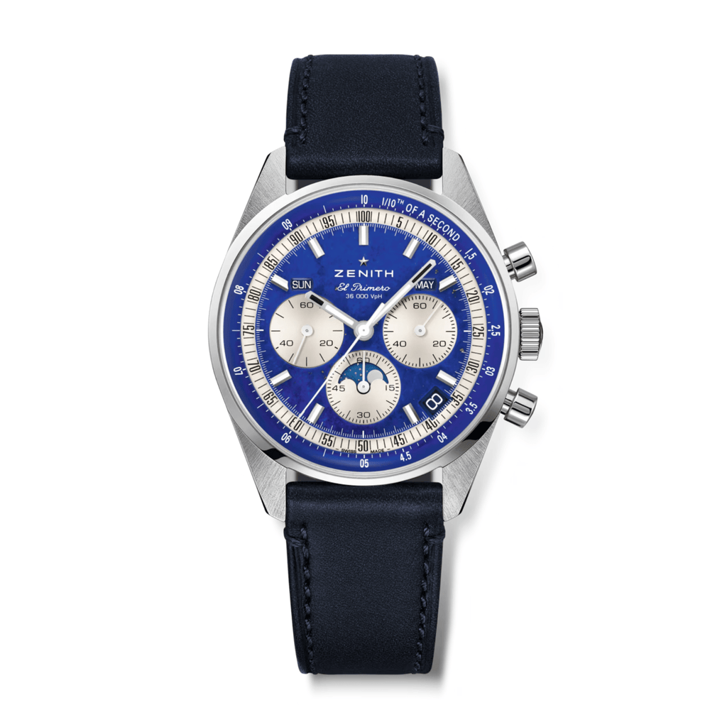 The CHRONOMASTER Original Triple Calendar is crafted in a 38mm steel case and comes with both a blue calfskin strap and a steel bracelet. The elegant lapis Lazuli dial has silver-colored counters. Powered by the El Primero 3610 automatic high-frequency movement with 1/10th of a second chronograph function combined with day, date, month and moonphase indications.